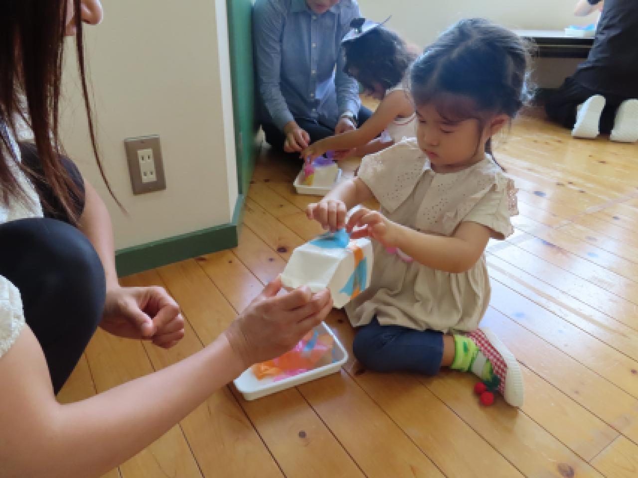 ③貼る・・・水糊をつけた土台(牛乳パックの上紙をはがしたもの)にペタペタ。重ねて貼った時の色の変化もおもしろいですね。
