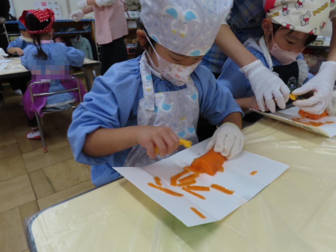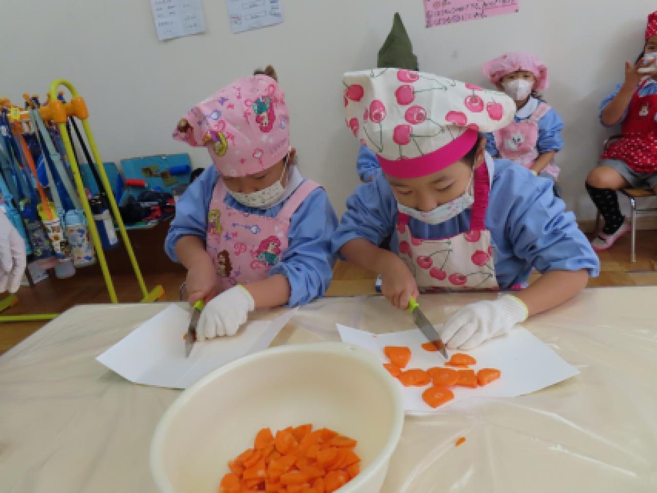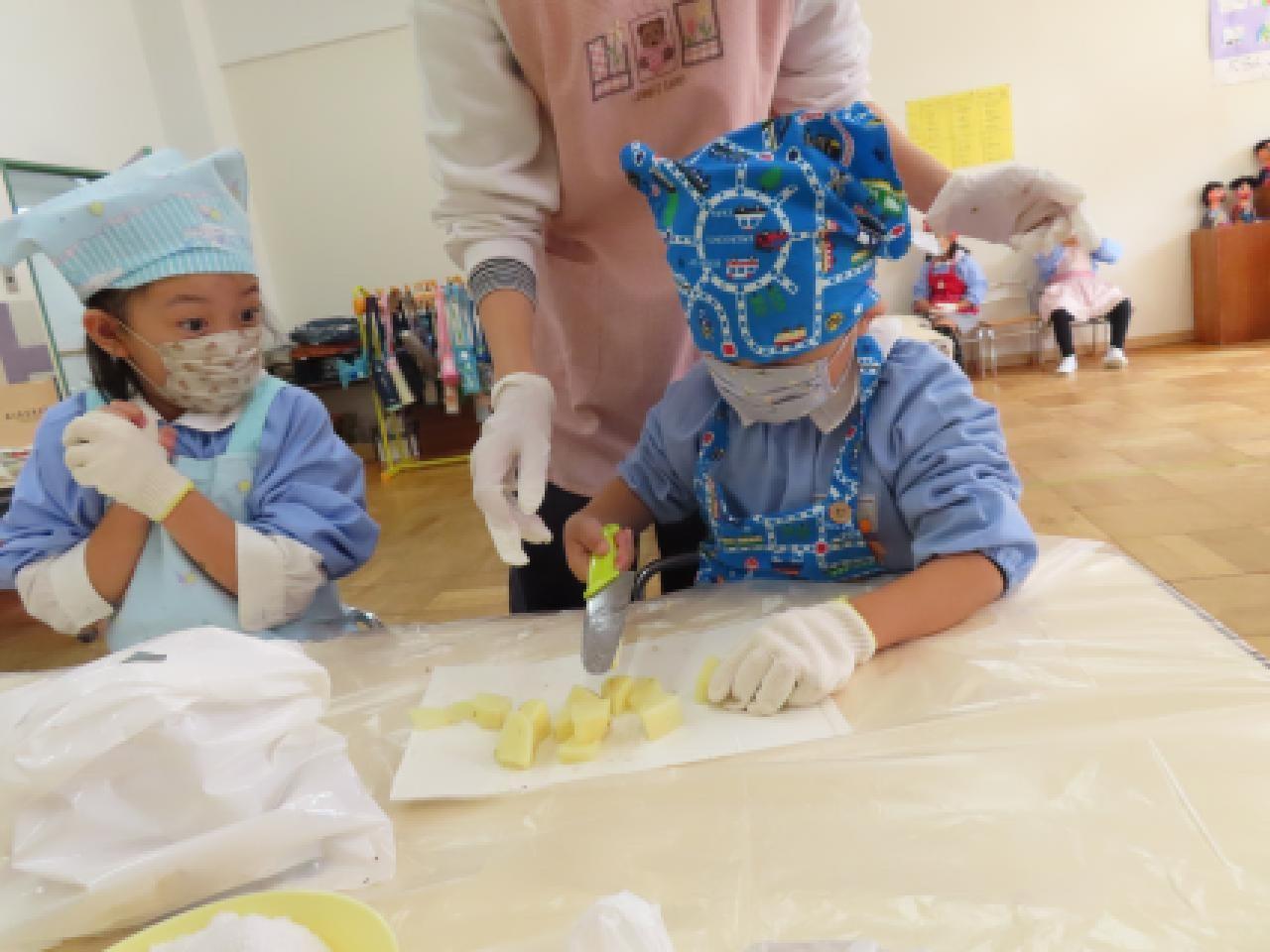 子どもたちは幼稚園でのクッキングにわくわくと、初めての包丁にちょっとどきどき