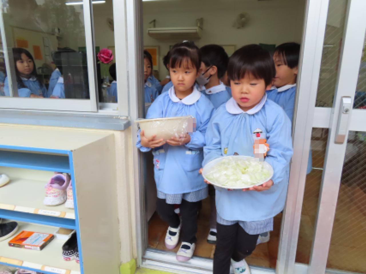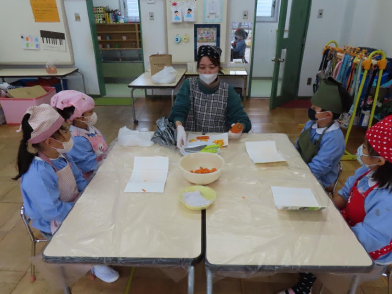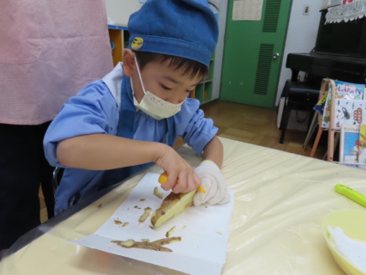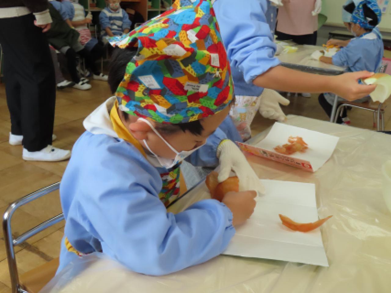 子どもたちは幼稚園でのクッキングにわくわくと、初めての包丁にちょっとどきどき
