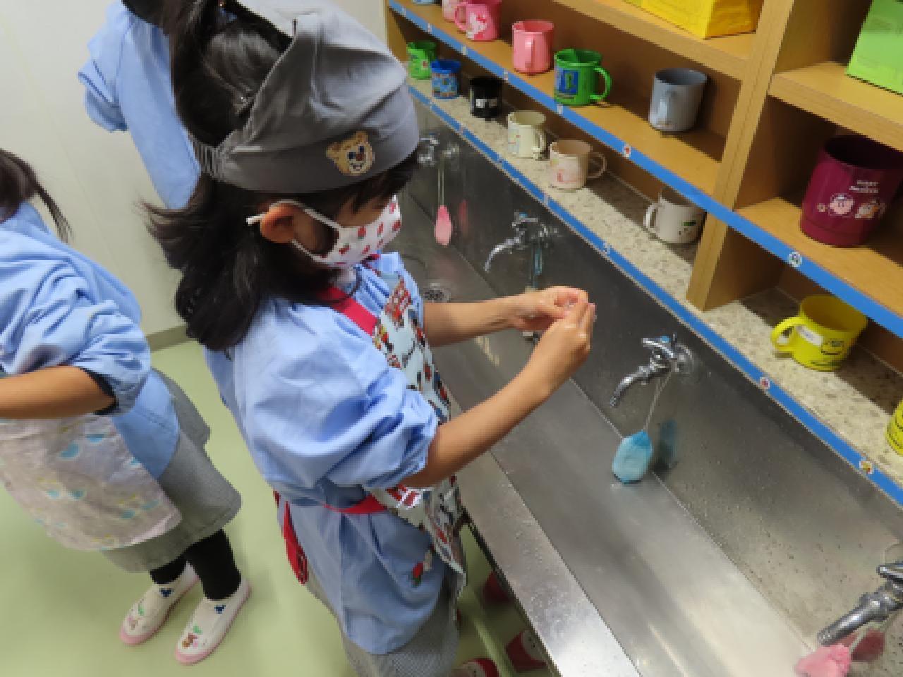 エプロン・三角巾・マスクをつけたら手をしっかり洗います