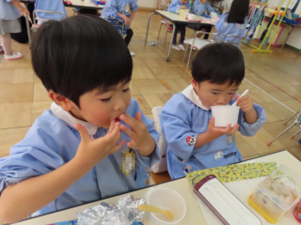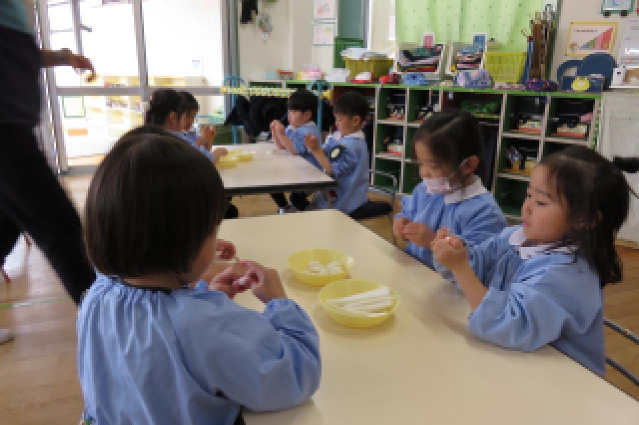 年中さん、年少さんが”炊き出し風豚汁”の下ごしらえ。