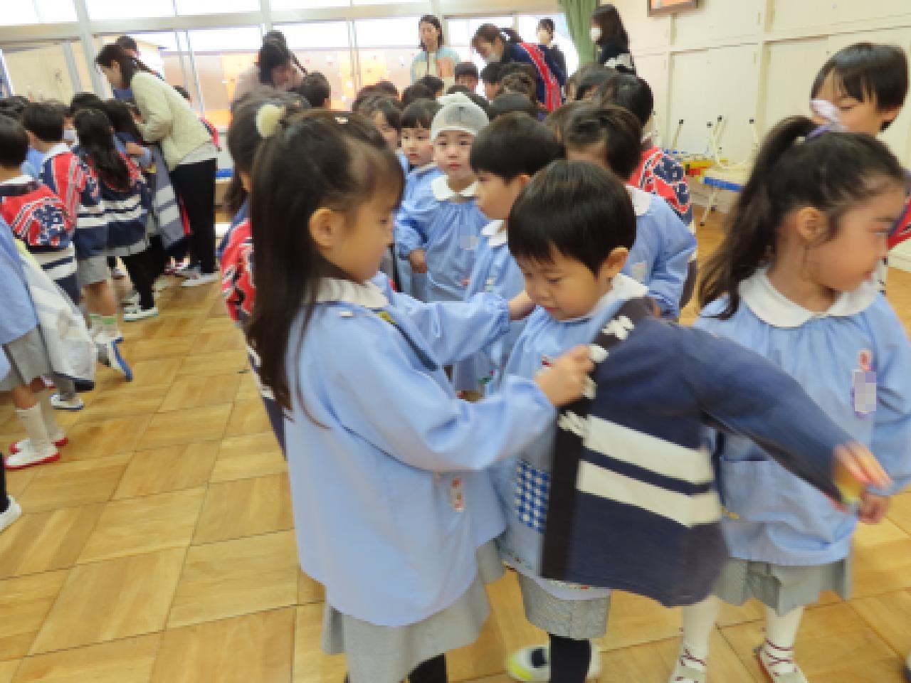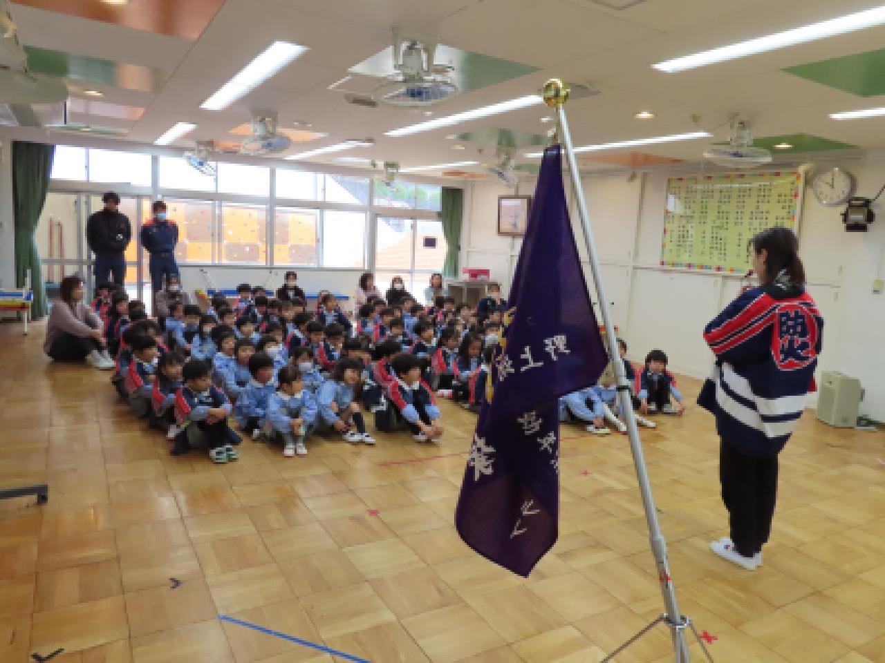 幼年消防のリーダーの証の法被を年長組から年中組に引き継ぎました。