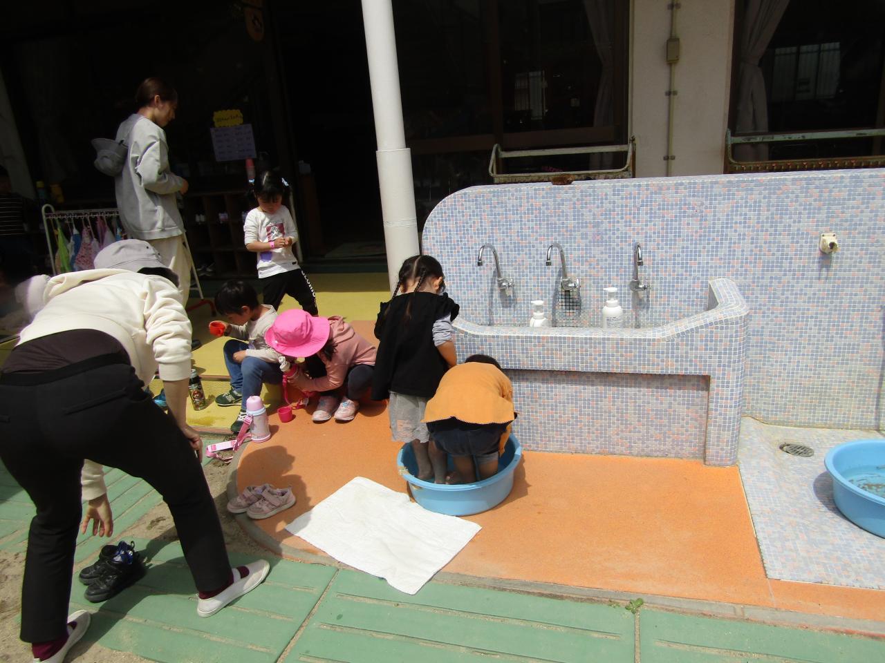 裸足で遊んだ後は、タライで足を自分でゴシゴシ・・・