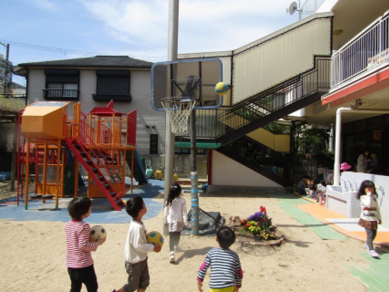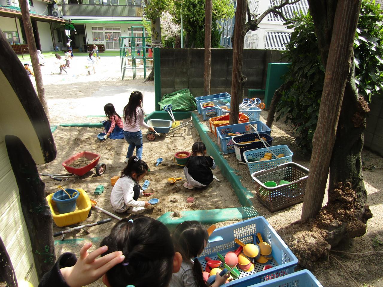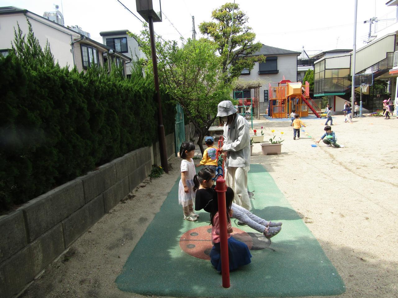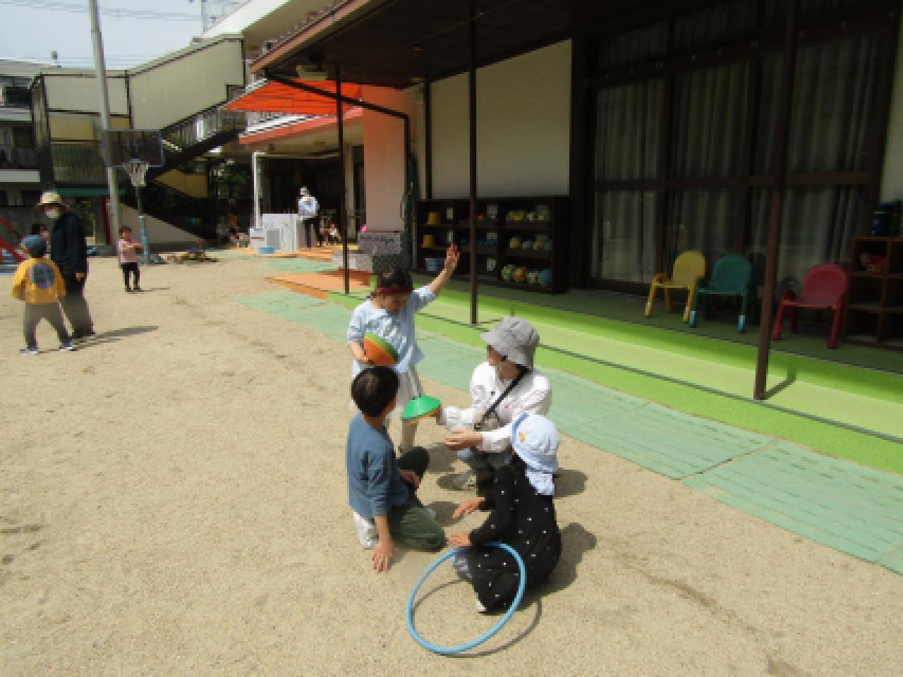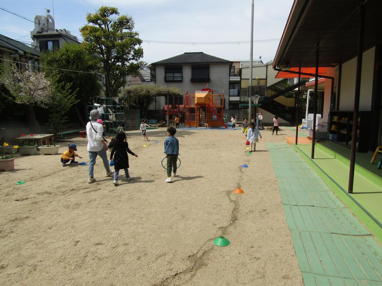 春風がそよそよ、青空の下で年中組・年少組さんが園庭で一緒に戸外遊びを楽しみました。