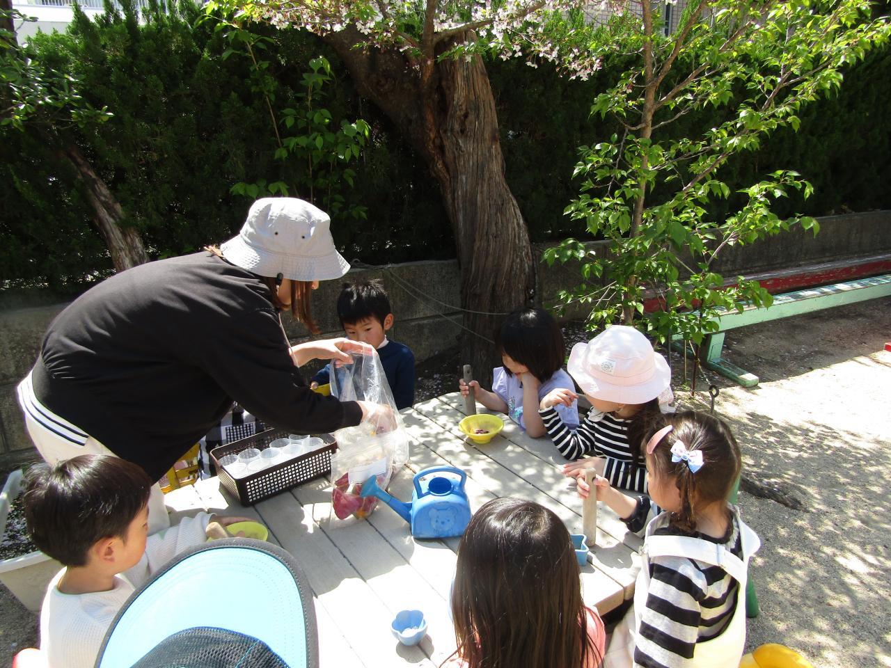 今日は、園庭の様々な花びらでジュースごっこ♪