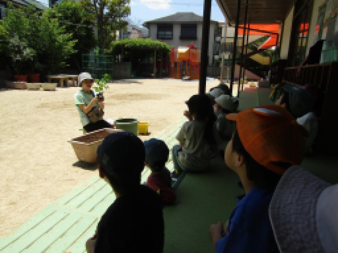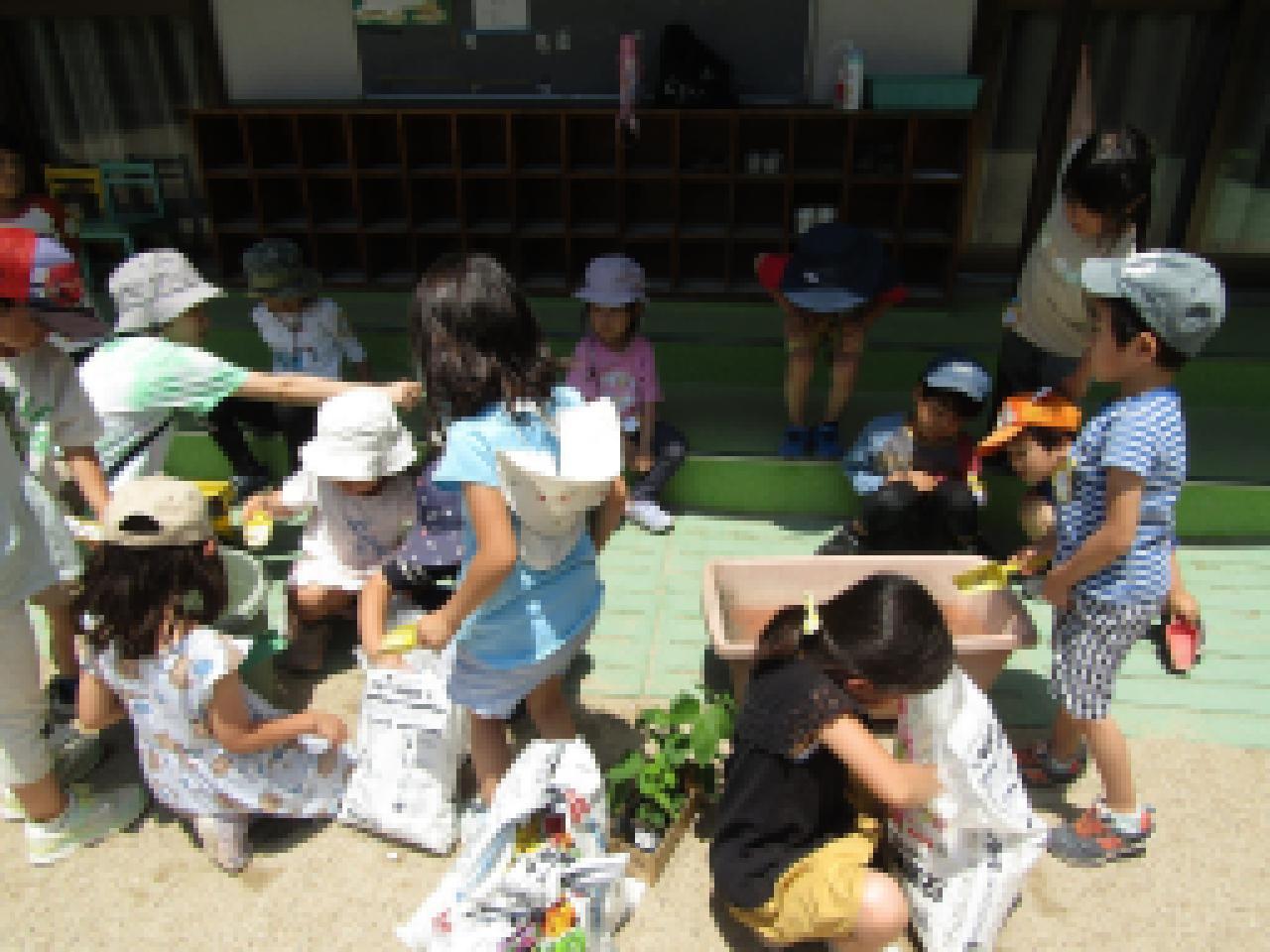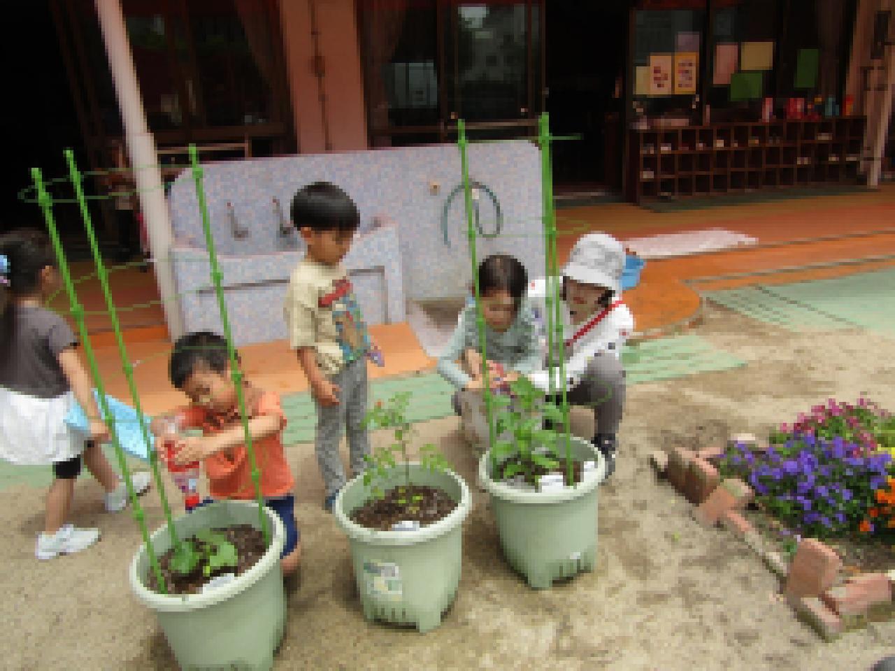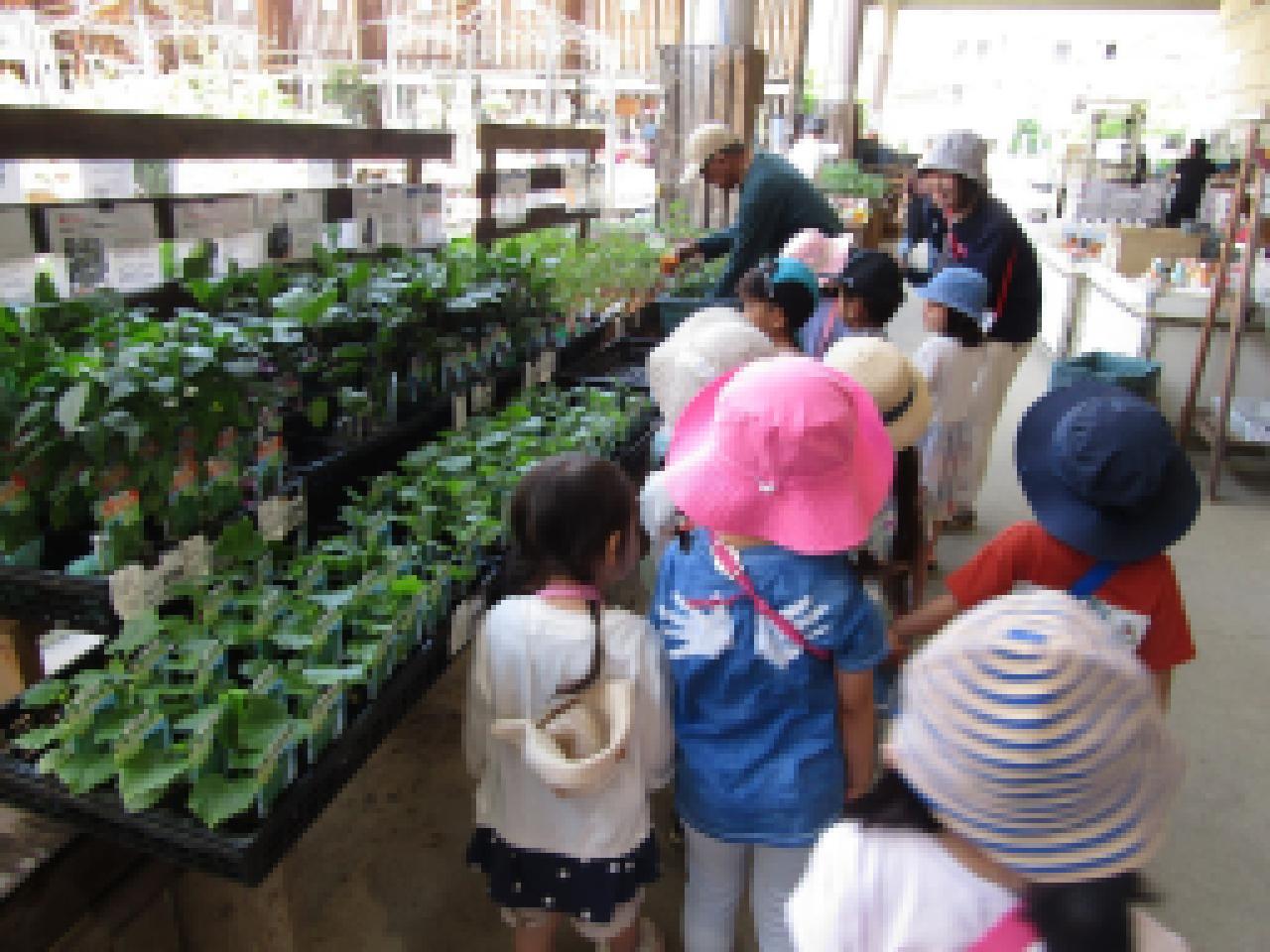 これからクラスで野菜やお花を植えることになり、みんなで一緒に絵本や図鑑などで調べたり、自分たちの育てたい苗を決め、画用紙に絵を描いたりして、夏野菜のイメージが広がっています。