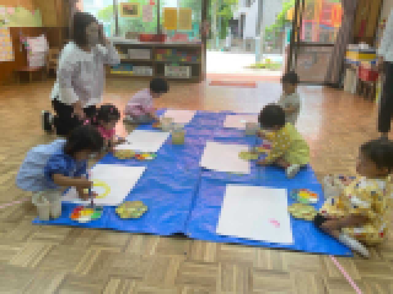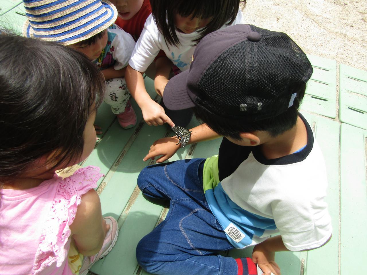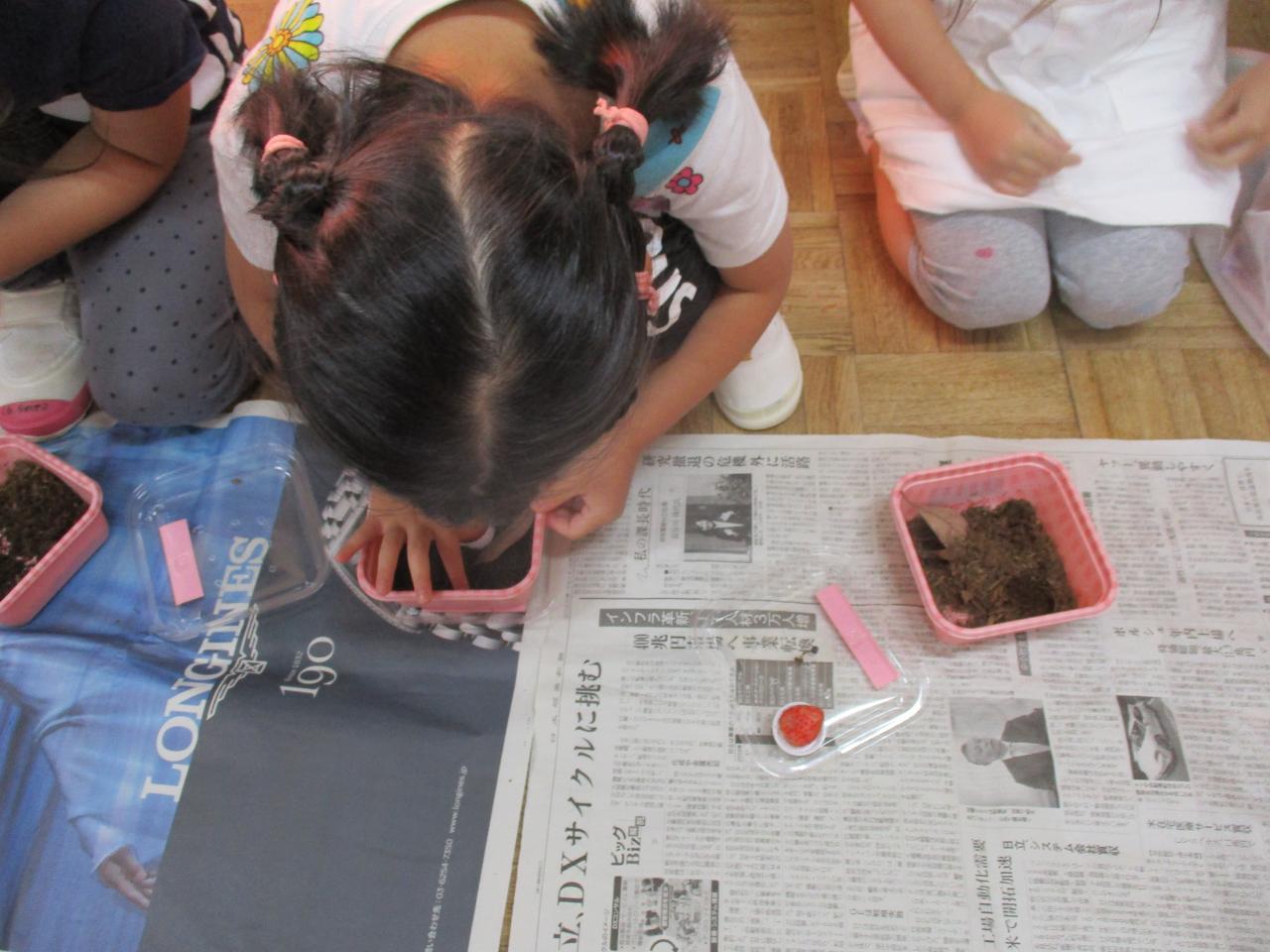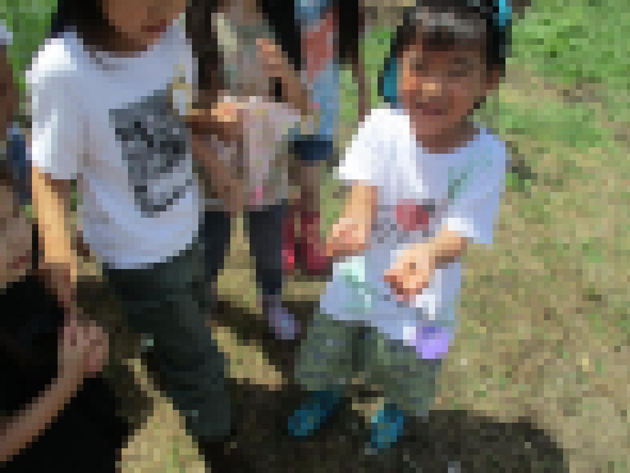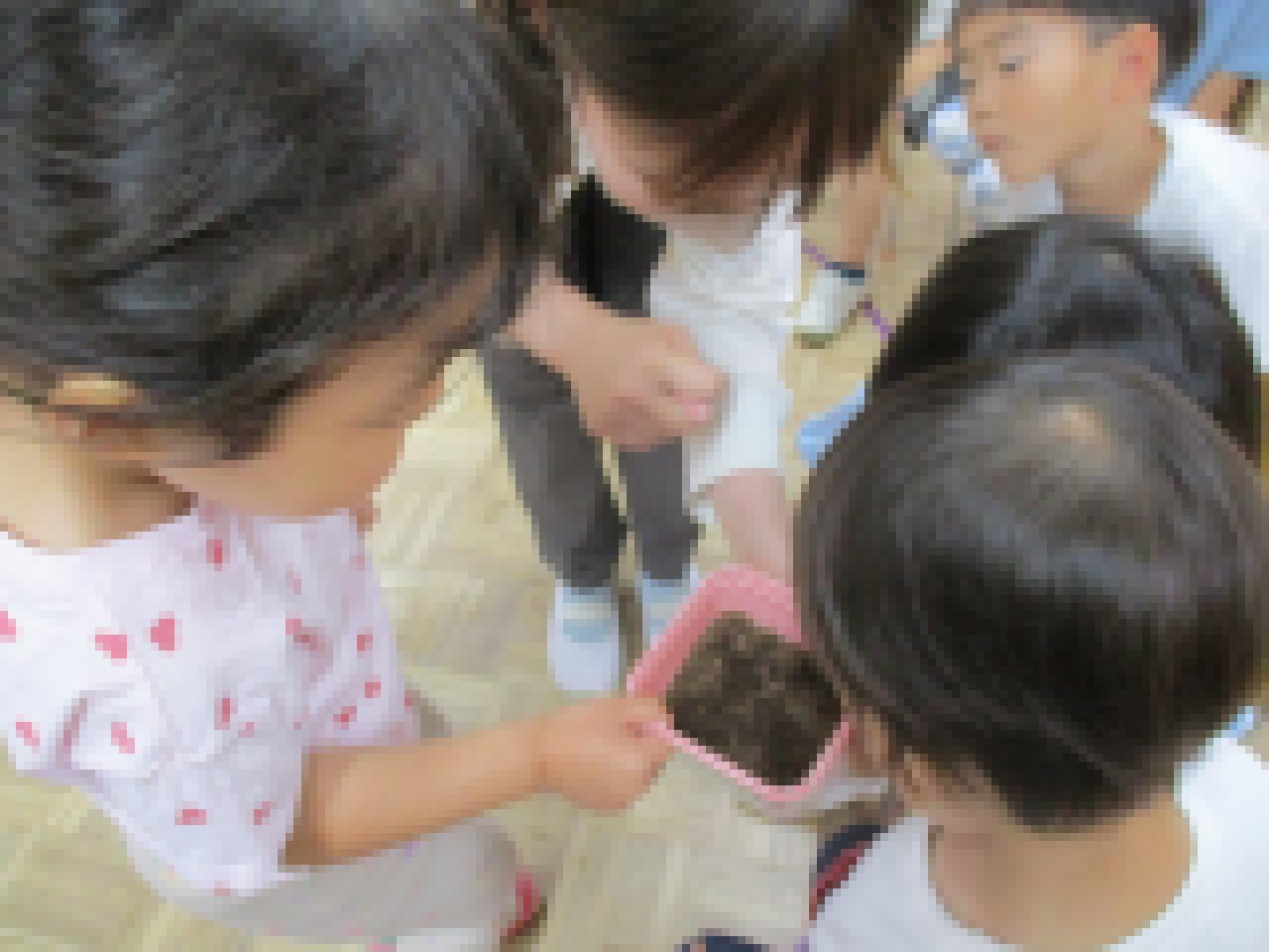 園庭などの身の回りの小さな自然をきっかけに、問いをもって探求したり、お友だちと対話したり、製作や絵を描いたり、歌をうたったり、身体をつかったり、様々な表現活動をして遊びにつなげています。みんなで見ること、聞くこと、話すこと、経験した思いを身体いっぱいで遊んでいます。小虫などに夢中になって遊ぶうちに小さいものがよく見えるようになります。遊びを通して自分の目でものを見て、心が豊かに満たされ育まれますように・・・。