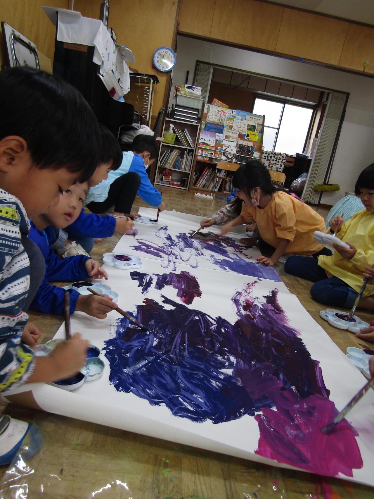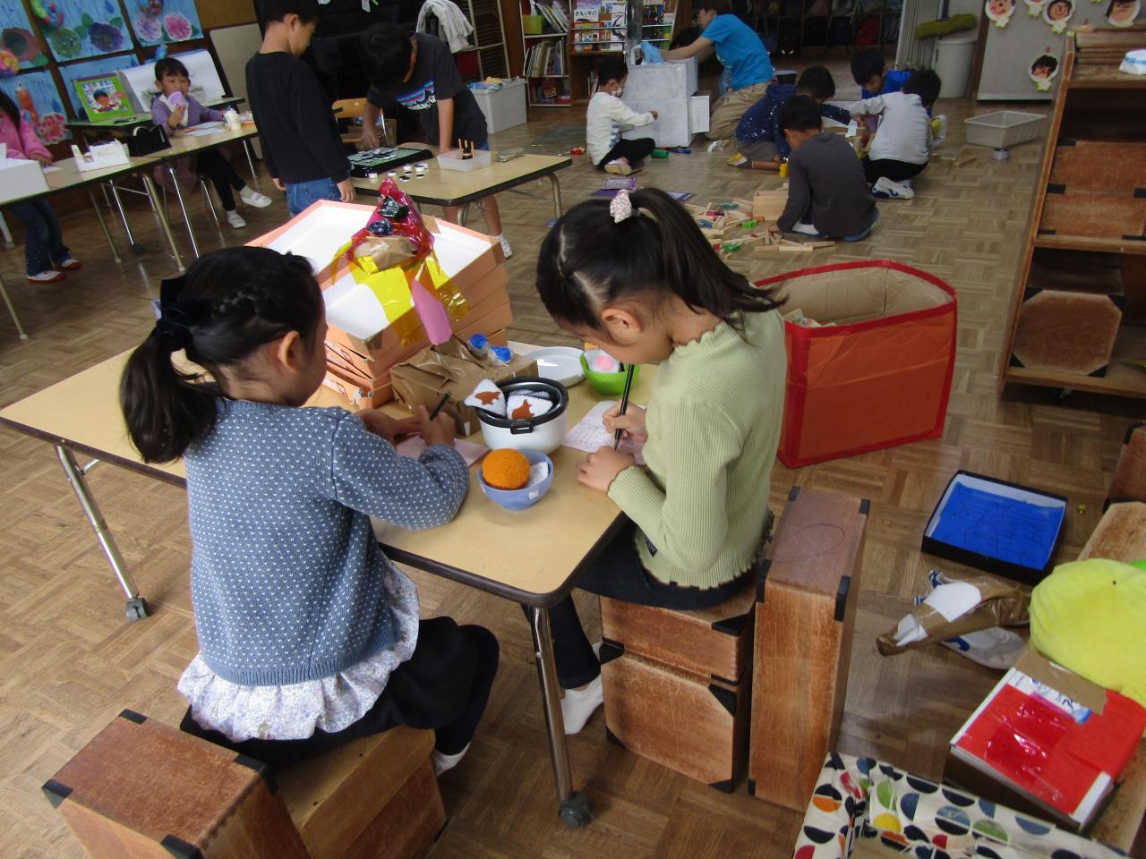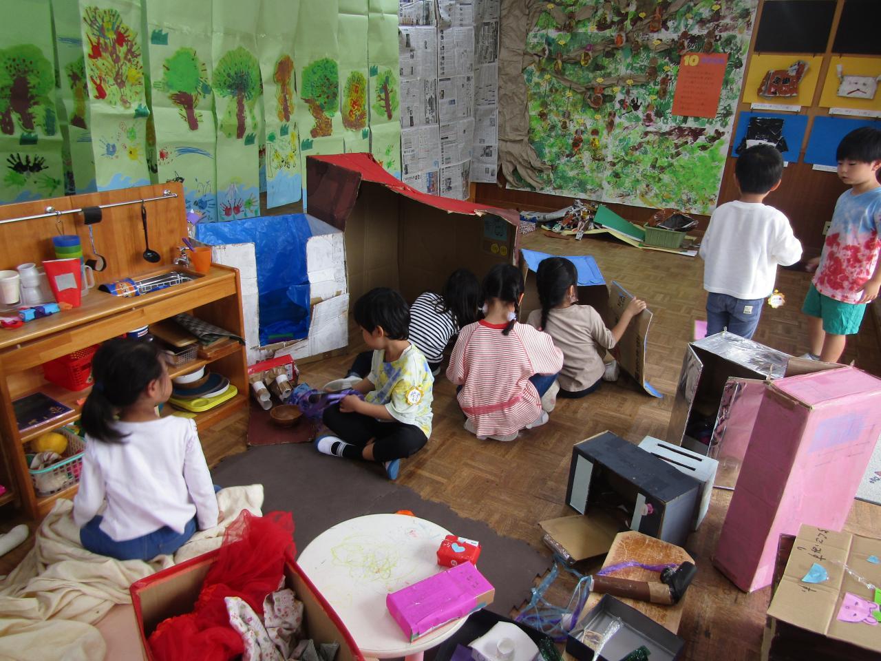 年長組・・・友だちと協働し、目的に向かって試行錯誤しながら作り上げる喜びを味わうことや意見がぶつかっても友だちと話し合い、互いに尊重し合いながら作品づくりを進めています。