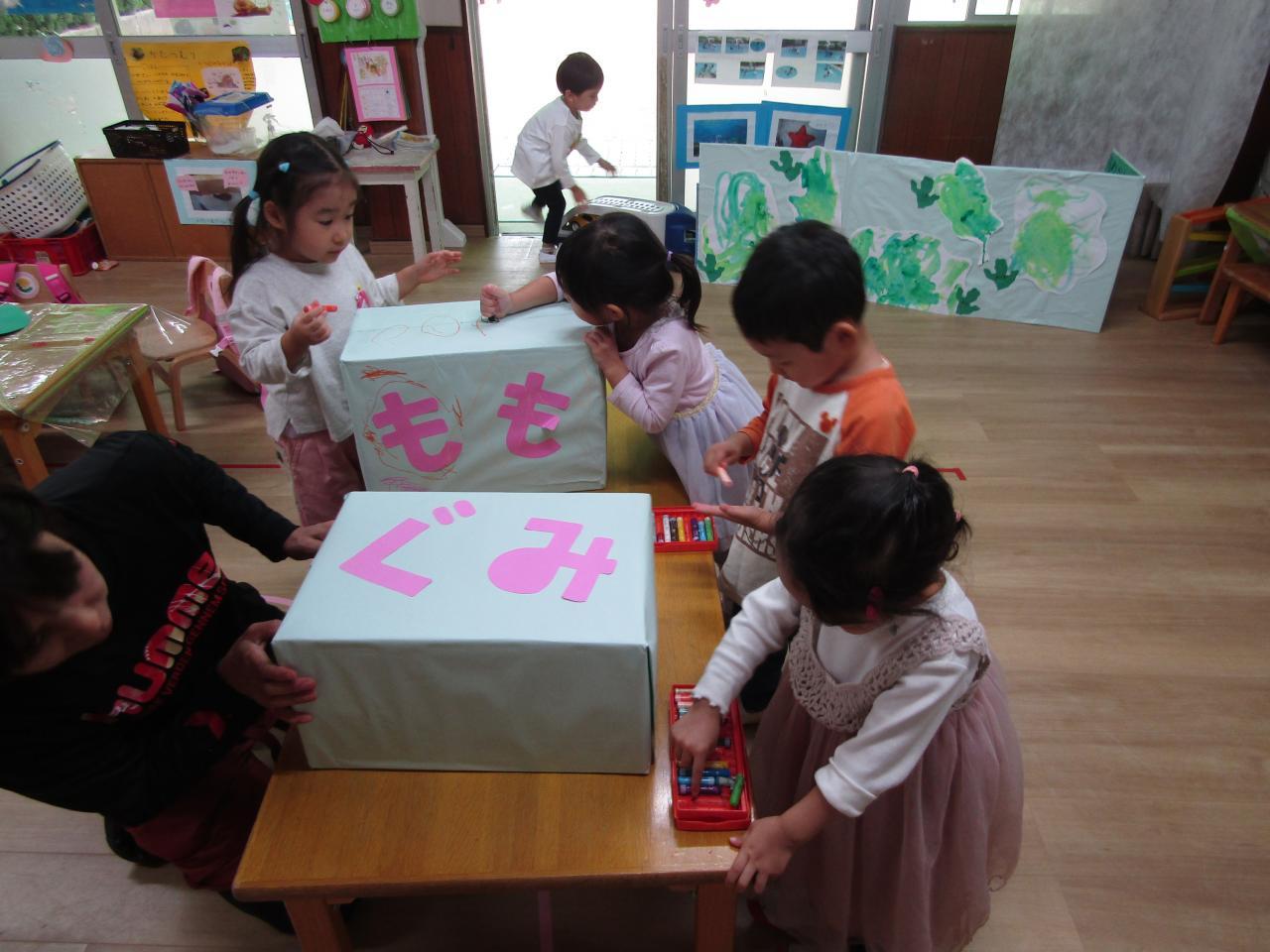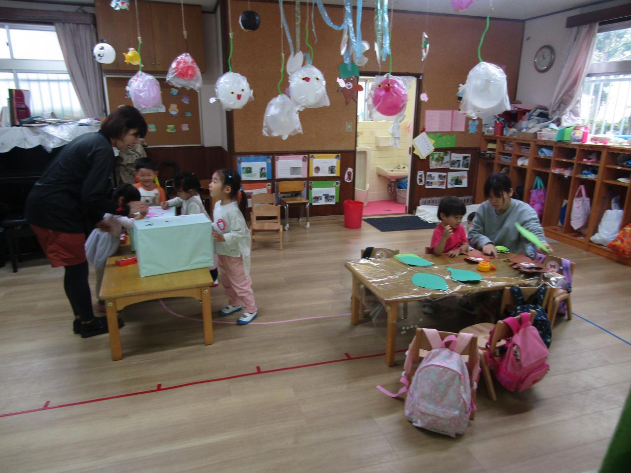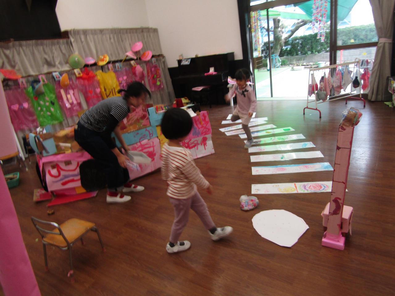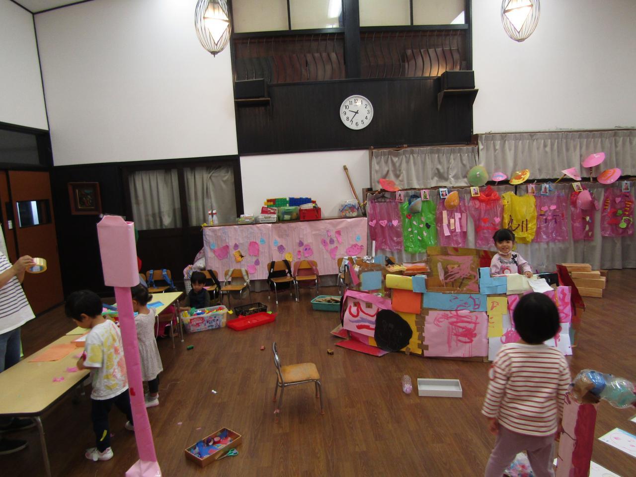 年中組・・みんなで商店街に出掛けた体験から、話し合い、自分の力でやり遂げる喜びを味わっています。物を作ることの楽しさも味わっています。
