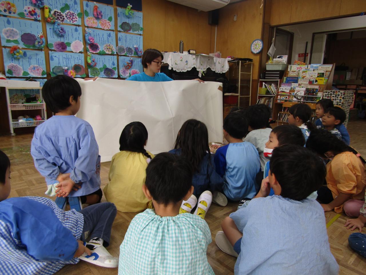 2歳児クラスの様子・・・園庭で見つけた虫、風の音、柔らかな日差し、保育者のお膝で読んでもらった絵本、心の思いを保育者と一緒に形にしています。