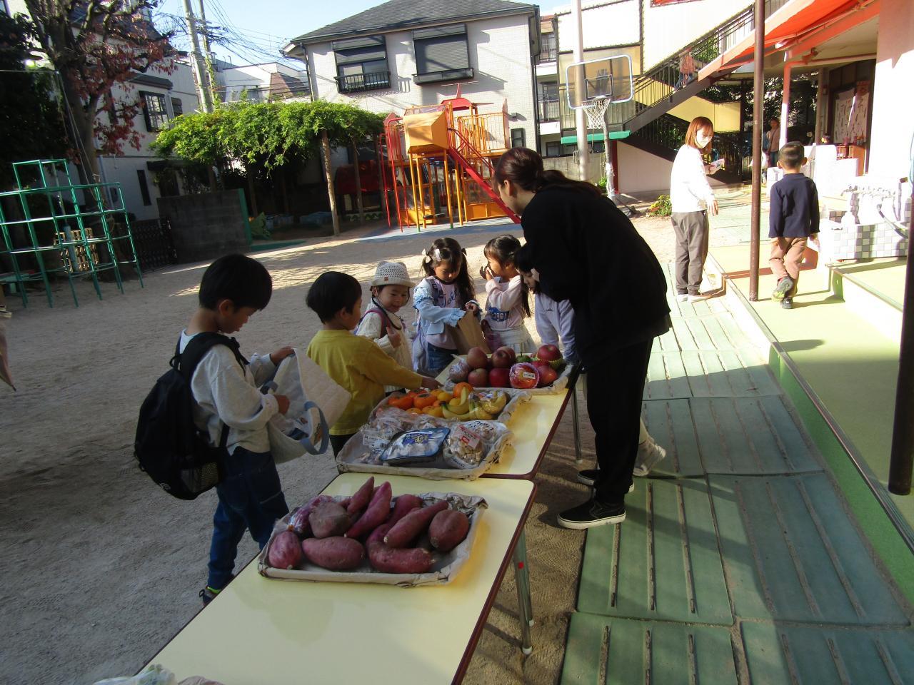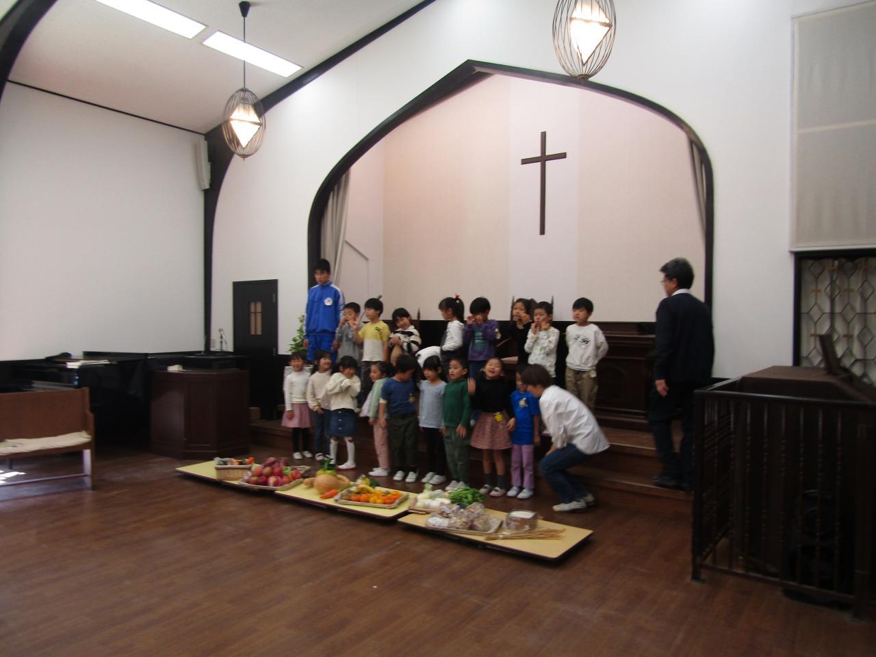 うれしい秋の実りです!豊かな実りを喜び、神さまに感謝を捧げる礼拝をみんなで一緒に守りました。私たちの命は、果物や野菜、そして生き物の命をもらってつないでいることを知り、収穫を与え、生命をつないでくださっている神さまの恵みに感謝します。今日はみんなで持ち寄った野菜や果物を囲んで、祈りを捧げました。