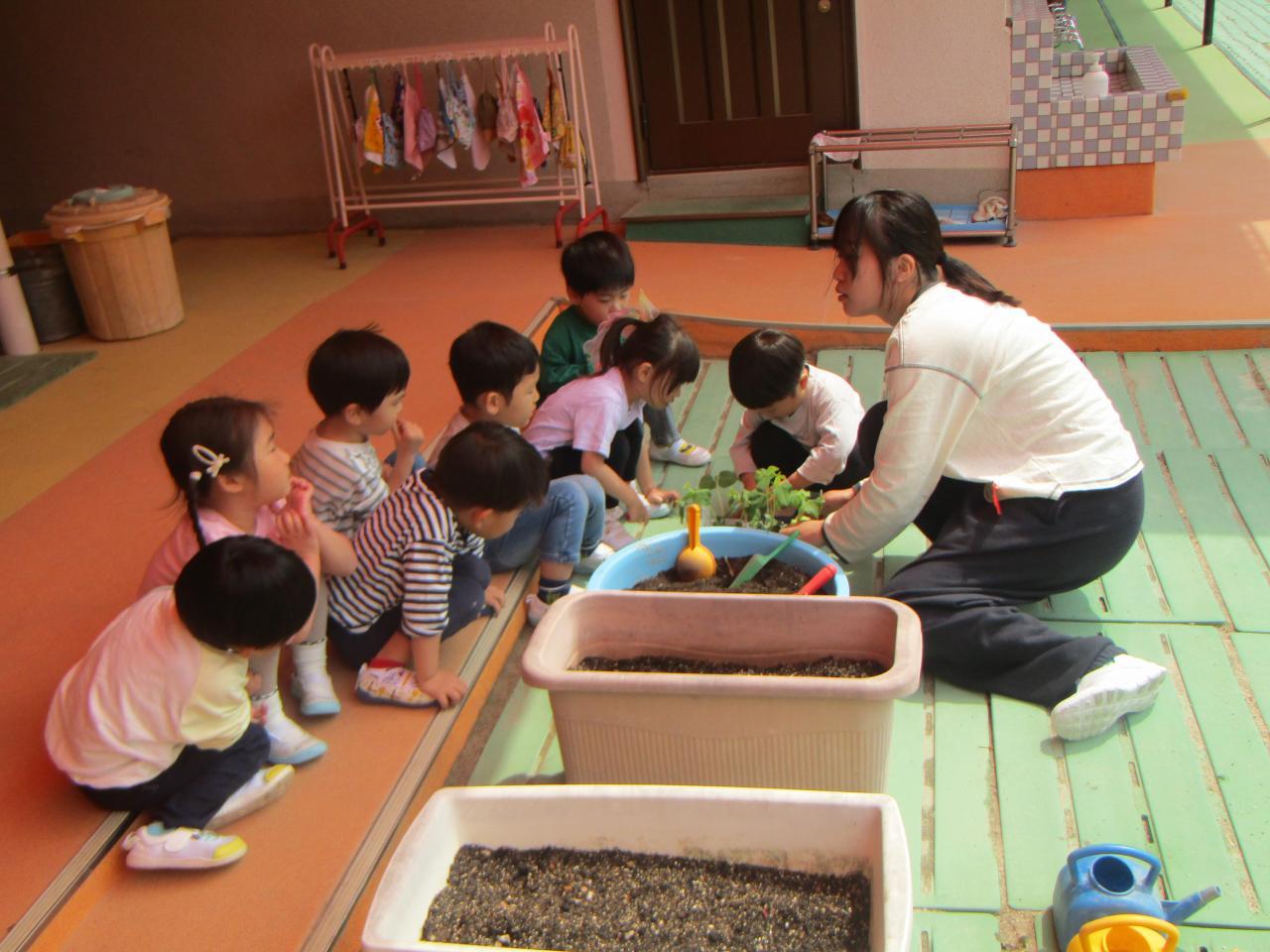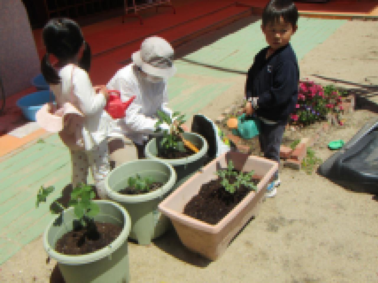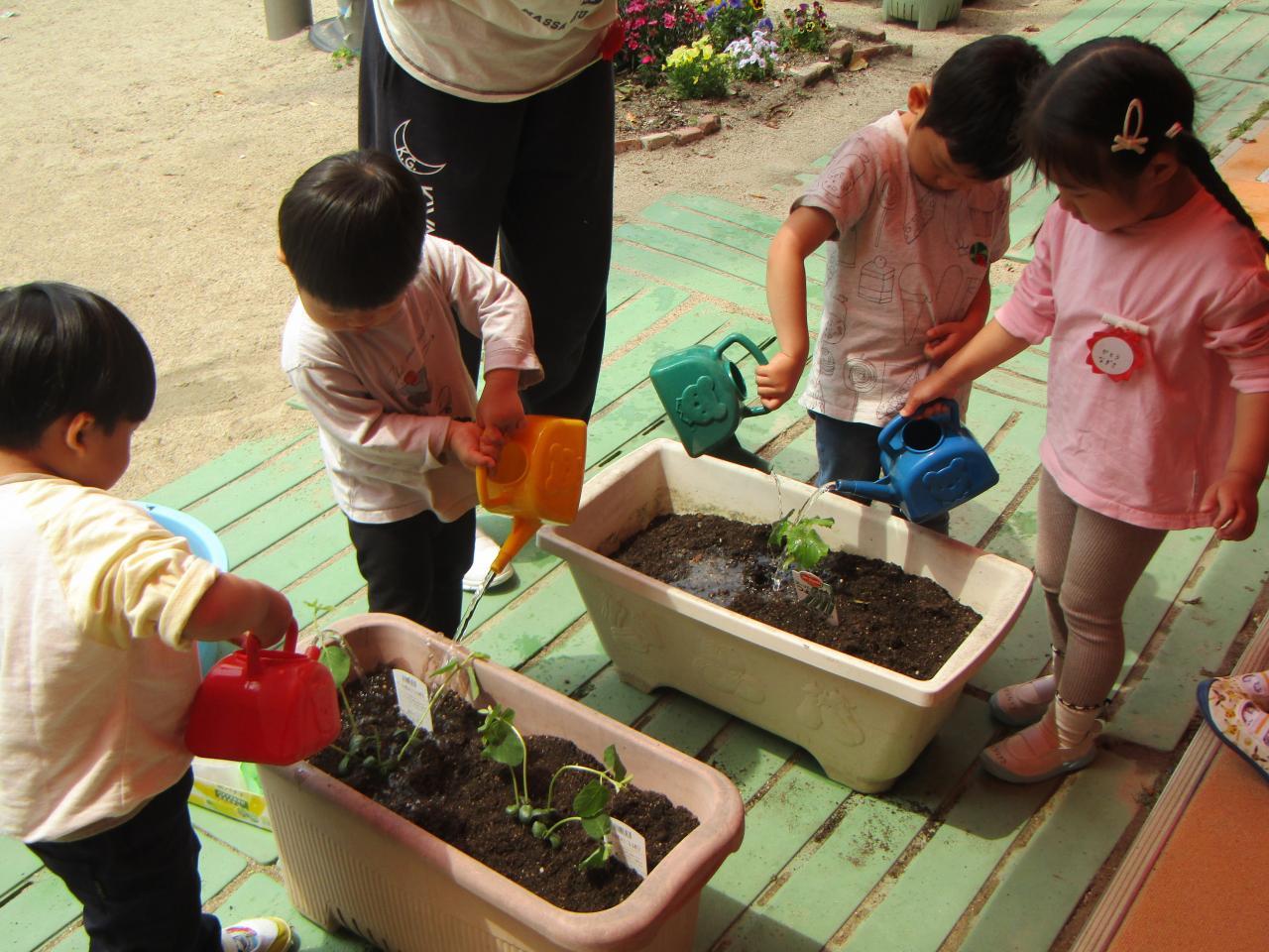 子どもたちが身近な環境に関われることができるよう、年少・年中・年長・2歳児クラスの子ども達それぞれ園庭のプランターに野菜の苗を植えました。
