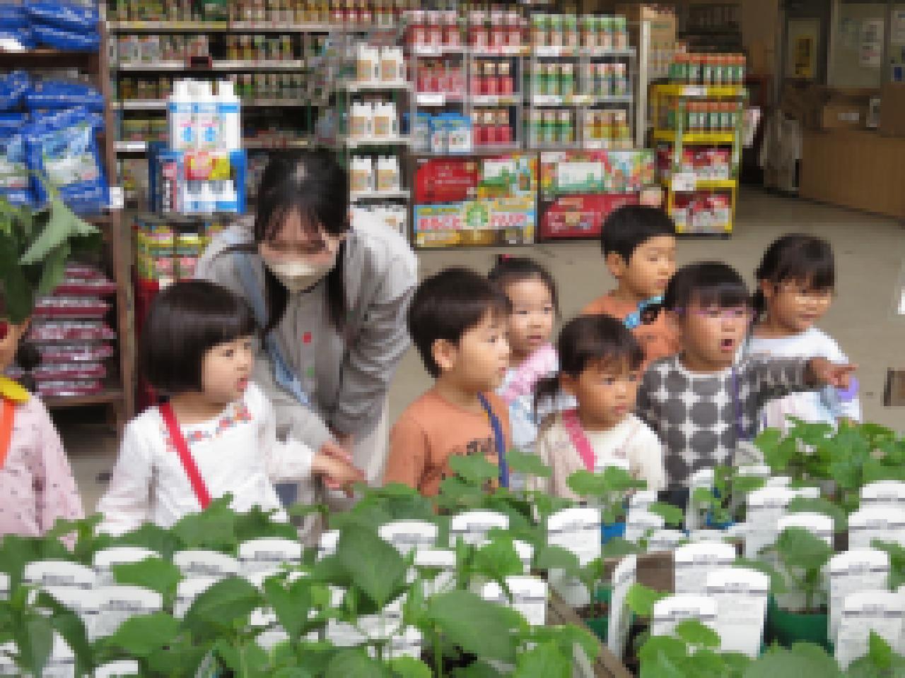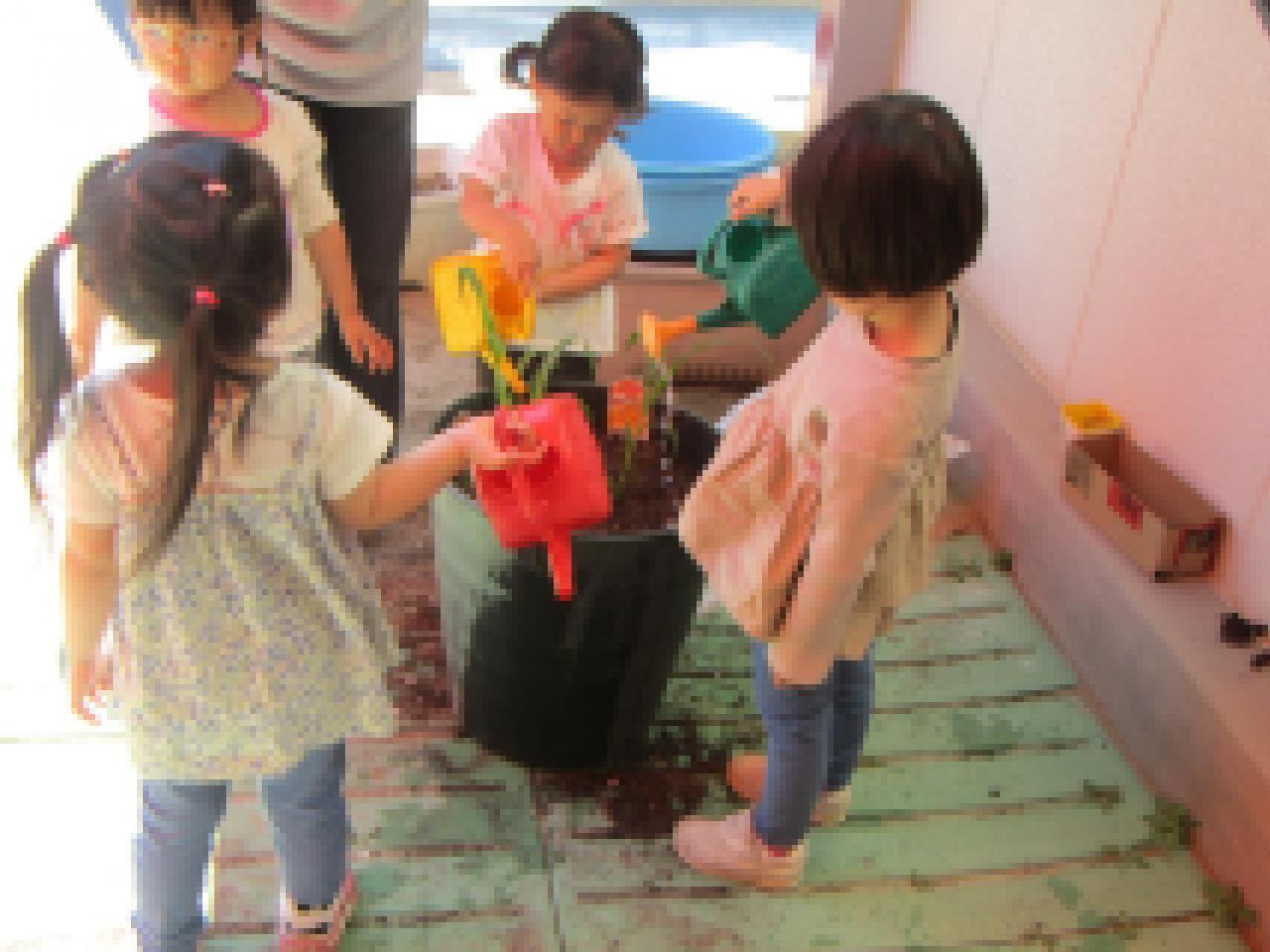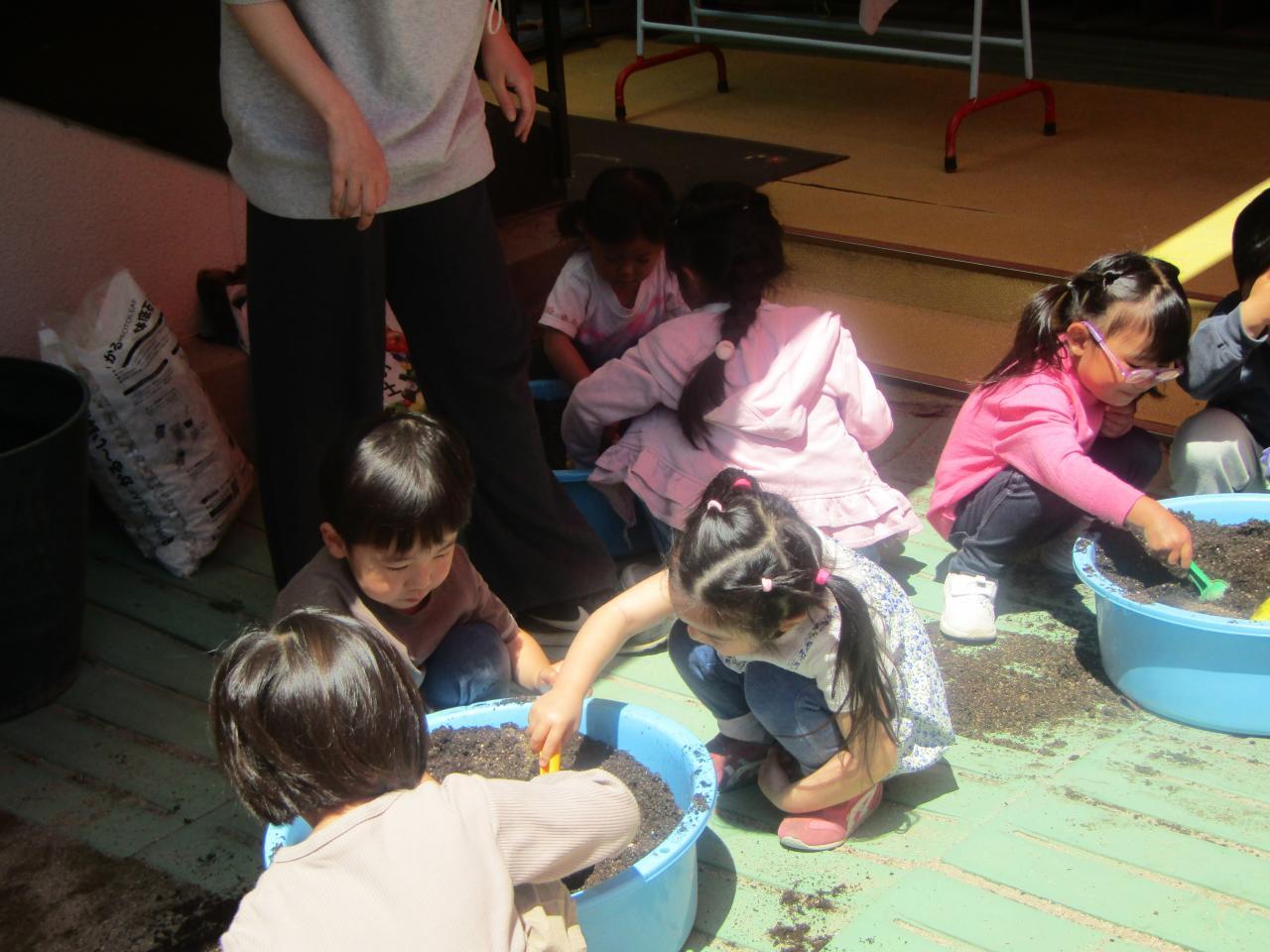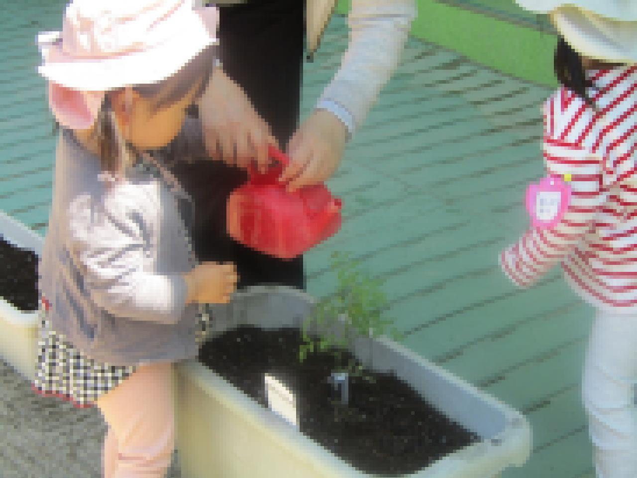 子どもたちが身近な環境に関われることができるよう、年少・年中・年長・2歳児クラスの子ども達それぞれ園庭のプランターに野菜の苗を植えました。