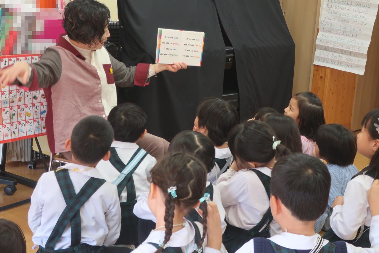 もも組ときく組は、The Month of the Year(1年の月名の歌)を導入。自分のお誕生月でジャンプしました。今日の絵本は、干支の馬にちなんで『GALLOP』ページをめくるたびに、動画のように動きます。次はどんな動物が出てくるか当てっこしながら読みました。