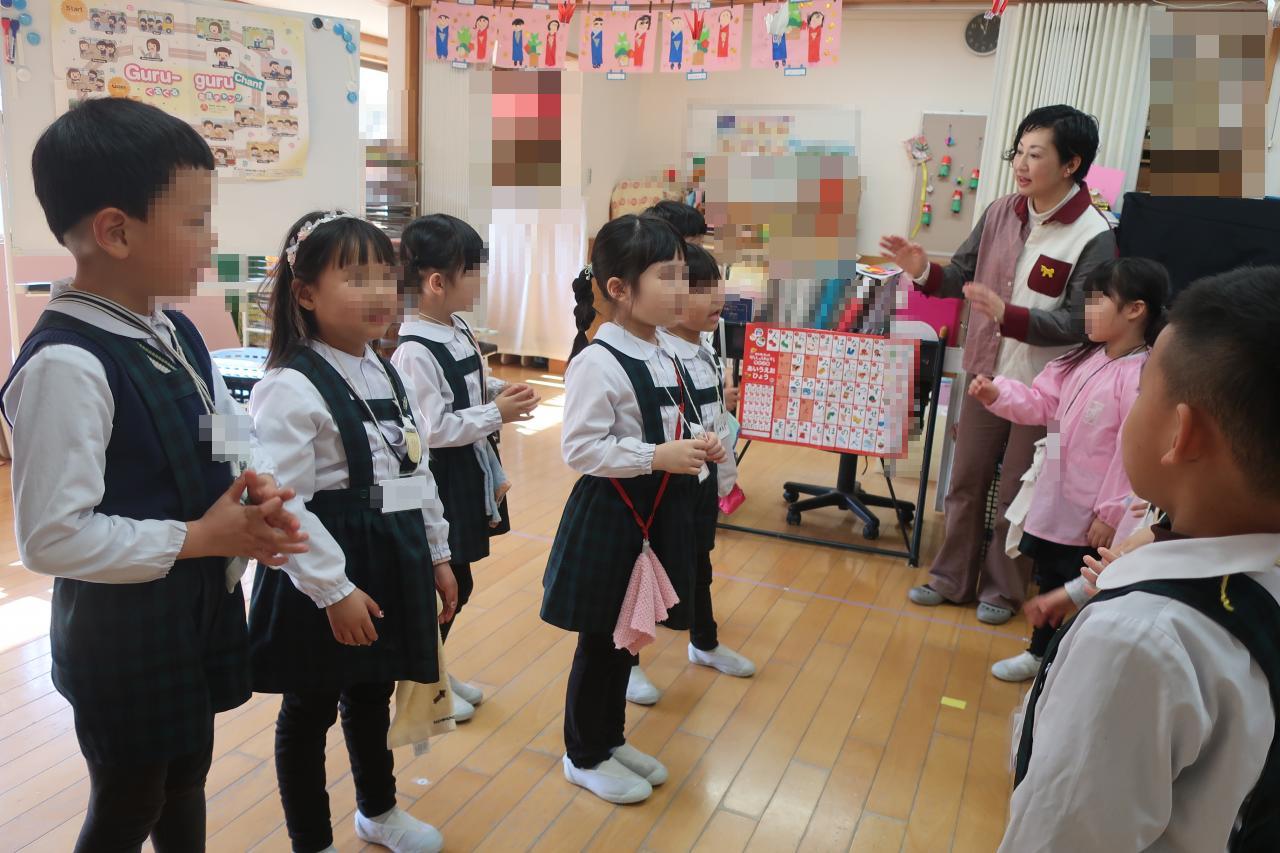 すみれ組とうめ組は、7 Stepsをお友だちとペアになって、どんどん人数が多くなって、最後にはみんなで手をつないで歌って踊りました。その度に、Happy New Year!と言いました。
