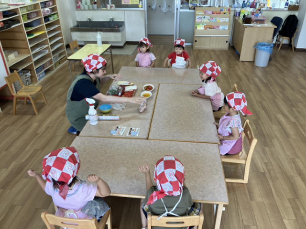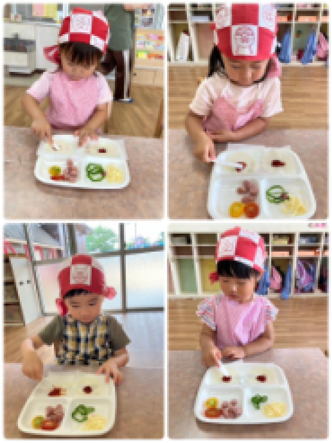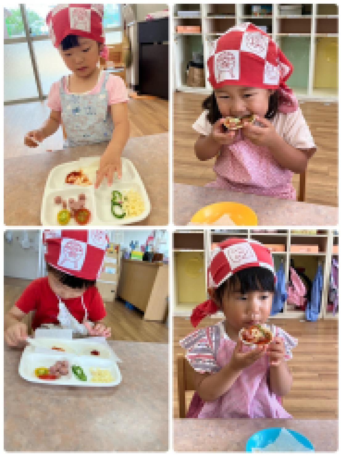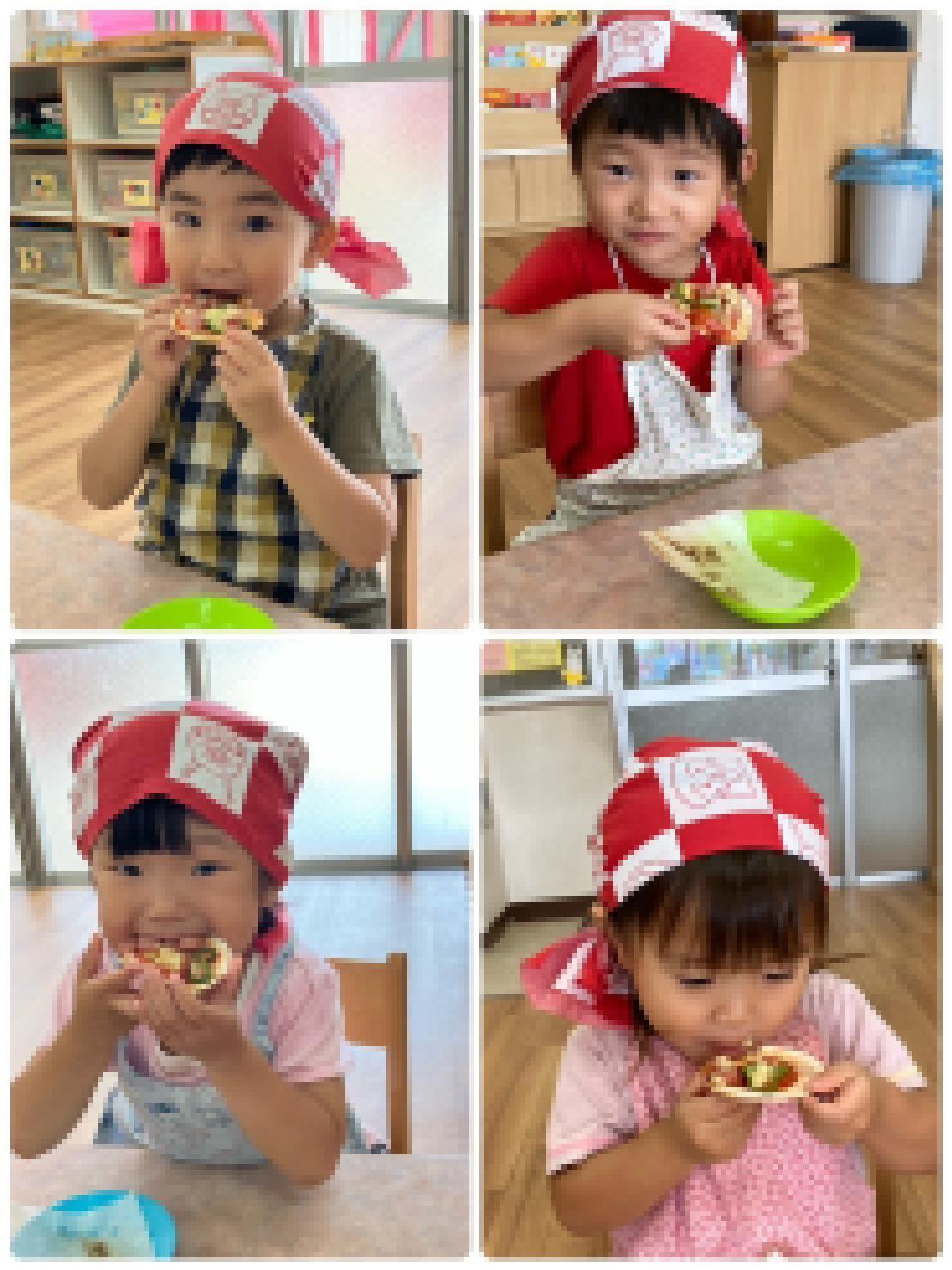 自分たちで育てたトマトピザ、とってもおいしかった様で6枚も食べるが沢山いてビックリしました!『お給食食べれなくなるからやめとこっか?』と声を掛けても、もう一枚食べたい〜!と大人気でした🍕!