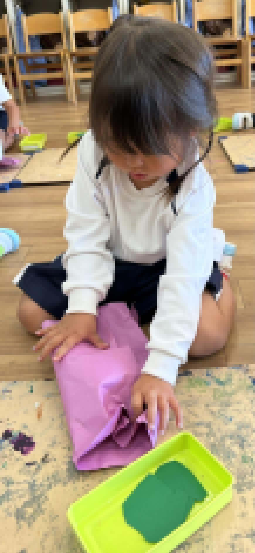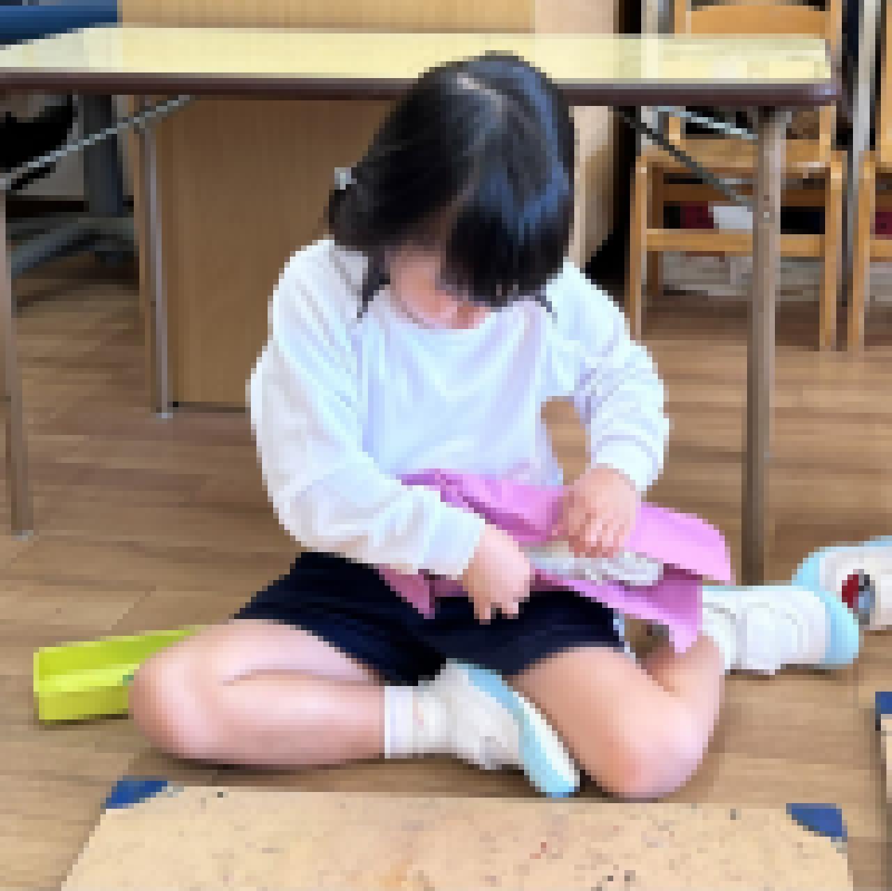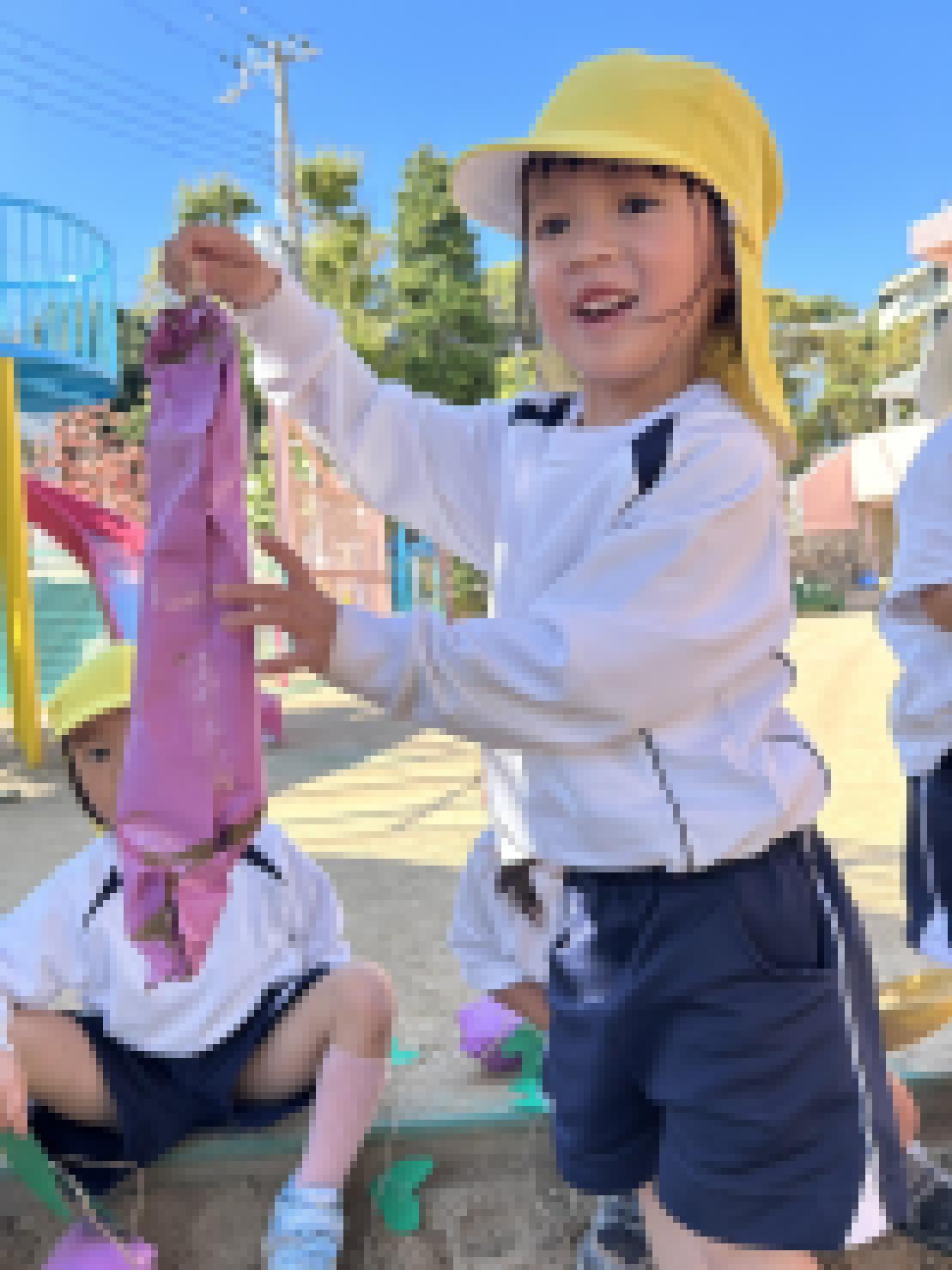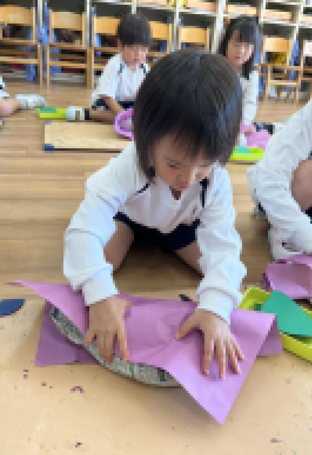 サツマイモは新聞紙で形を作り、その上から紫色の画用紙をまいて作りました!葉っぱはどんな形?と聞くと写真を見て「ハート♡のかたち!」「はんたいにするとモモ🍑みたいだよ!」と答える子どもたち☺️形を意識しながら描いて切りました!