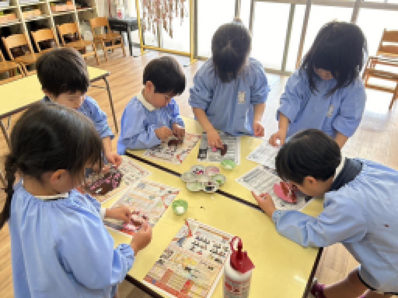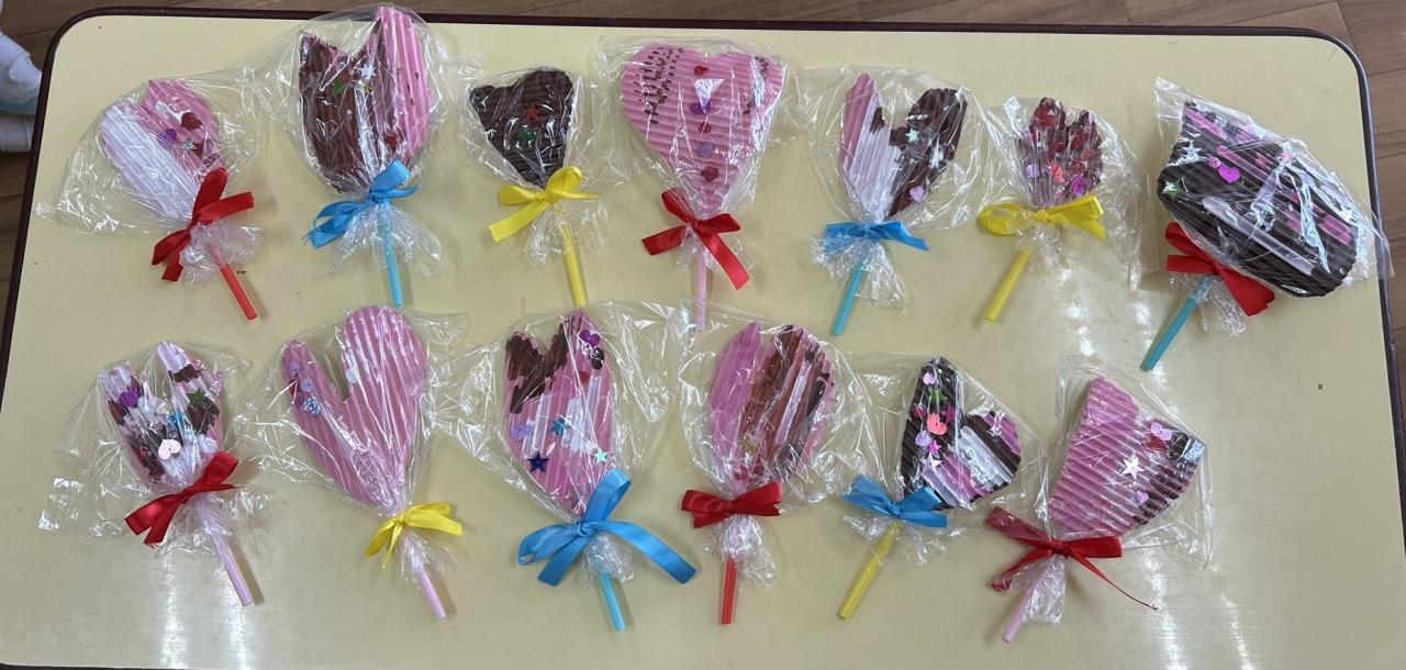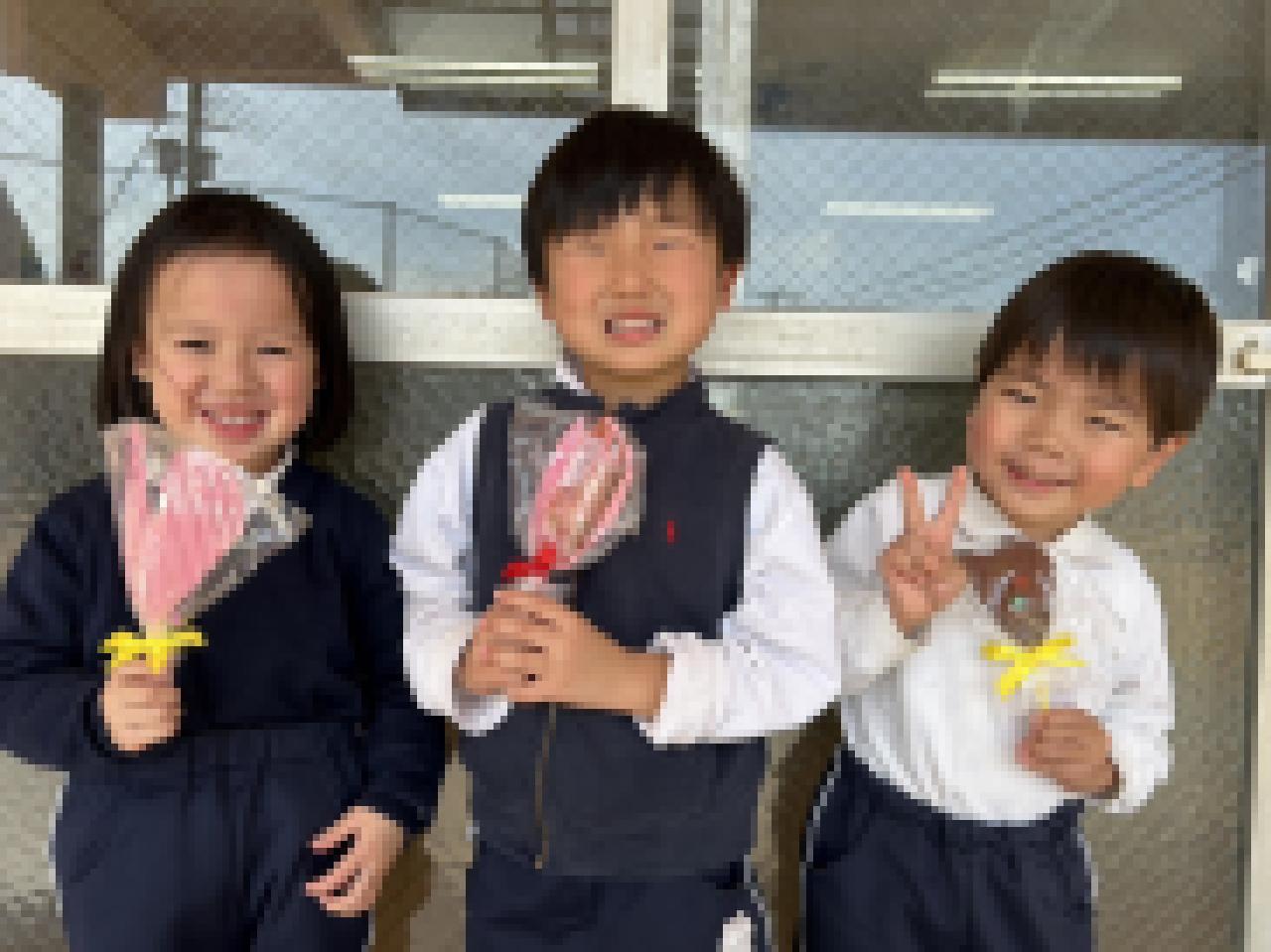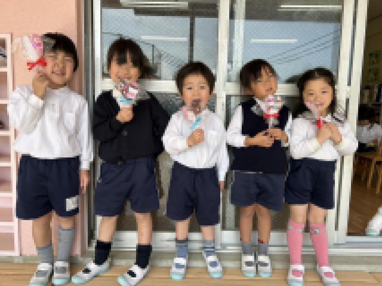 最後に袋に入れてリボンをつけるととってもかわいいチョコができました!食べる真似をしながら「でもかみやからたべられへんけどな〜!」と得意げな顔のみんながかわいかったです♡
