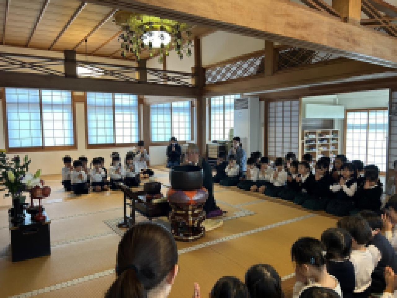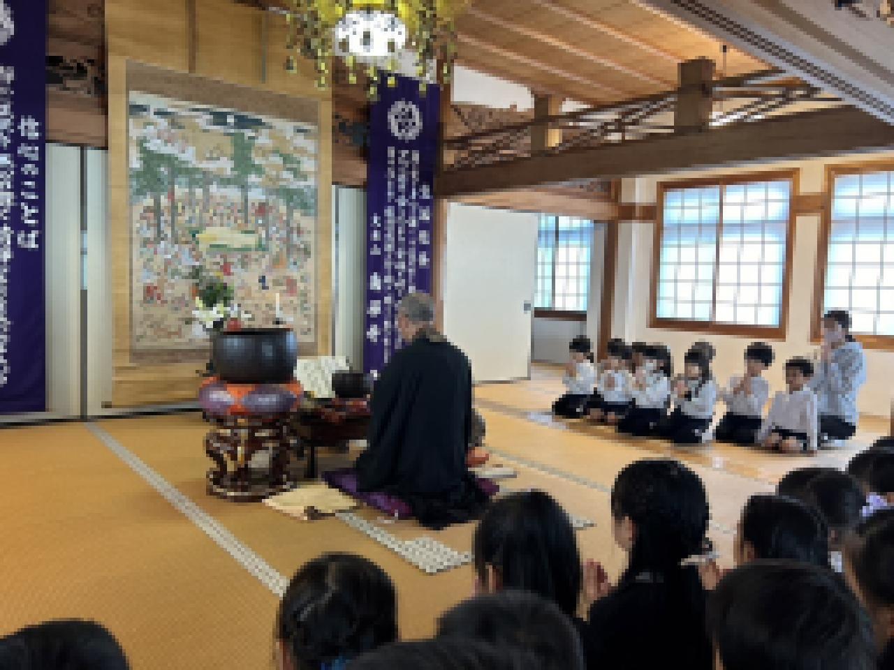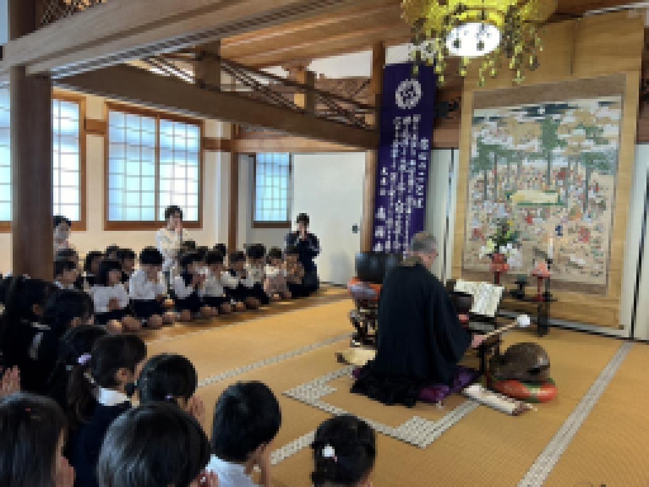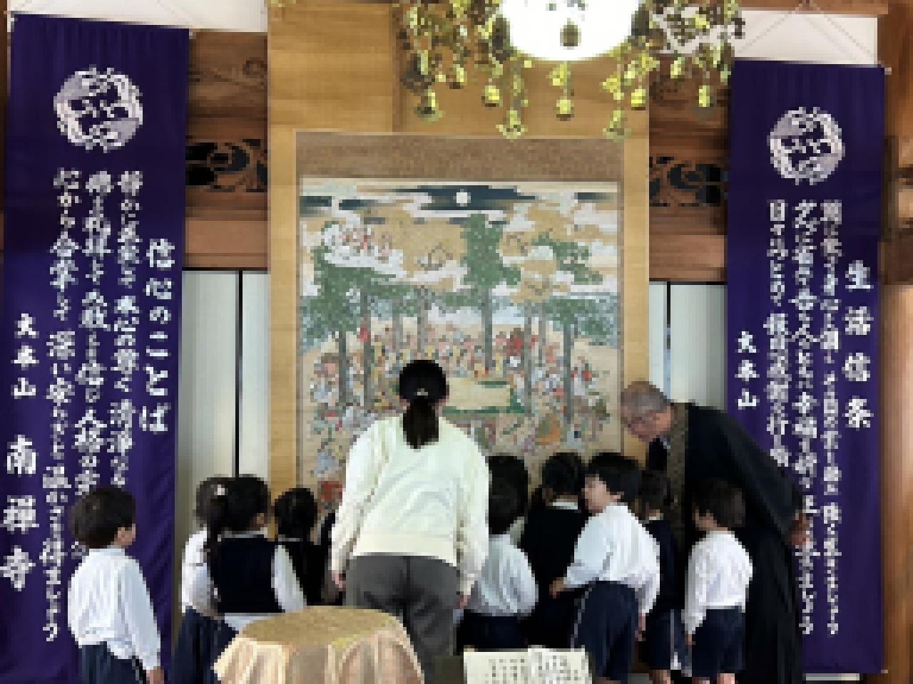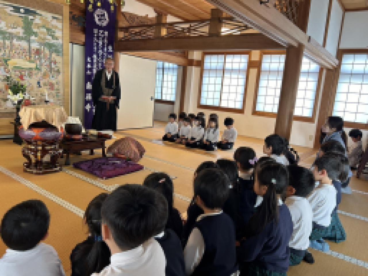 涅槃会では、一つしかない命を大事にすること、生かされている事は、自然や動物、魚や野菜からたくさんの「いのち」を頂いていきていること、色んな人に感謝をすること。そして、困っている人がいたら、助けてあげられる優しい人になること。などを園長先生からお話を聞きました。