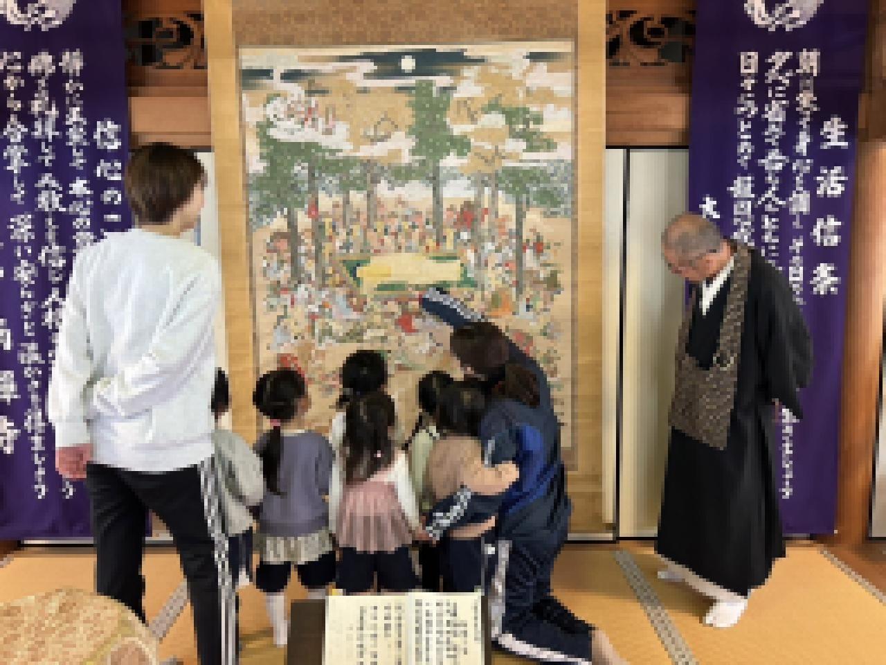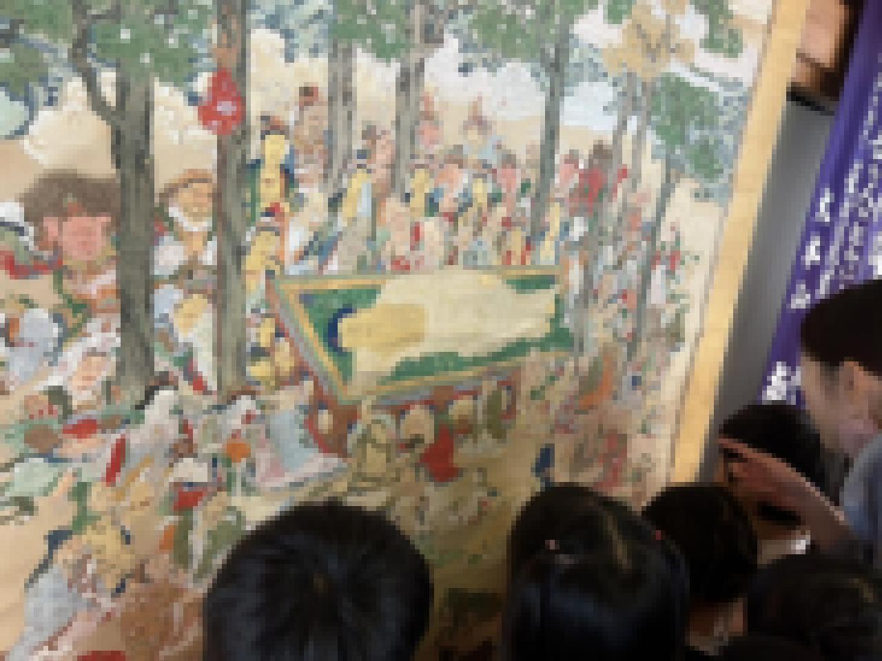 お釈迦様の臨終を描いた、北を枕に西をむいて横たわるお釈迦様が描かれた「涅槃図」の説明を聞きました。