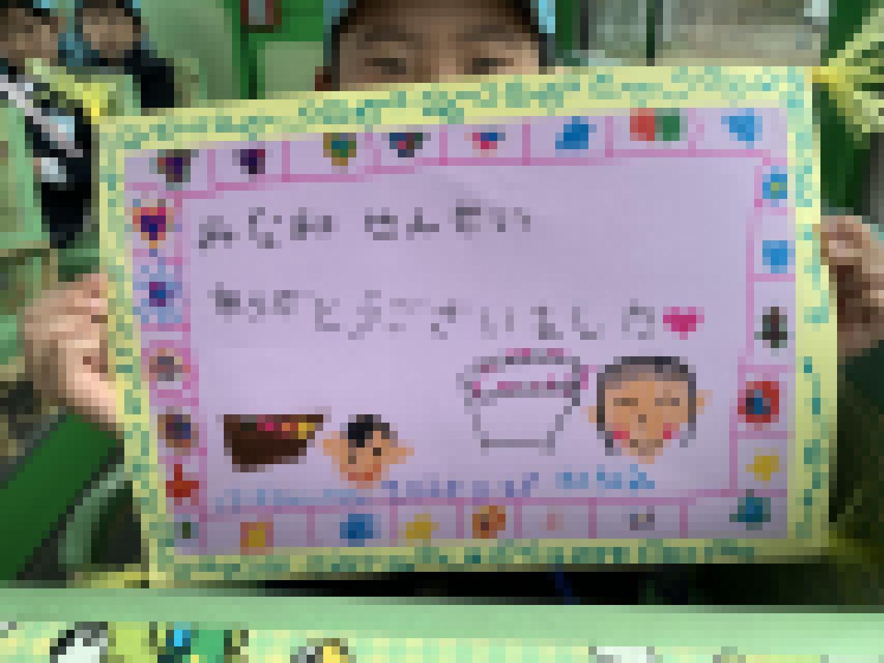 みんなで字や絵をかいて作ったまほうのじゅうたん型の手紙をもって、