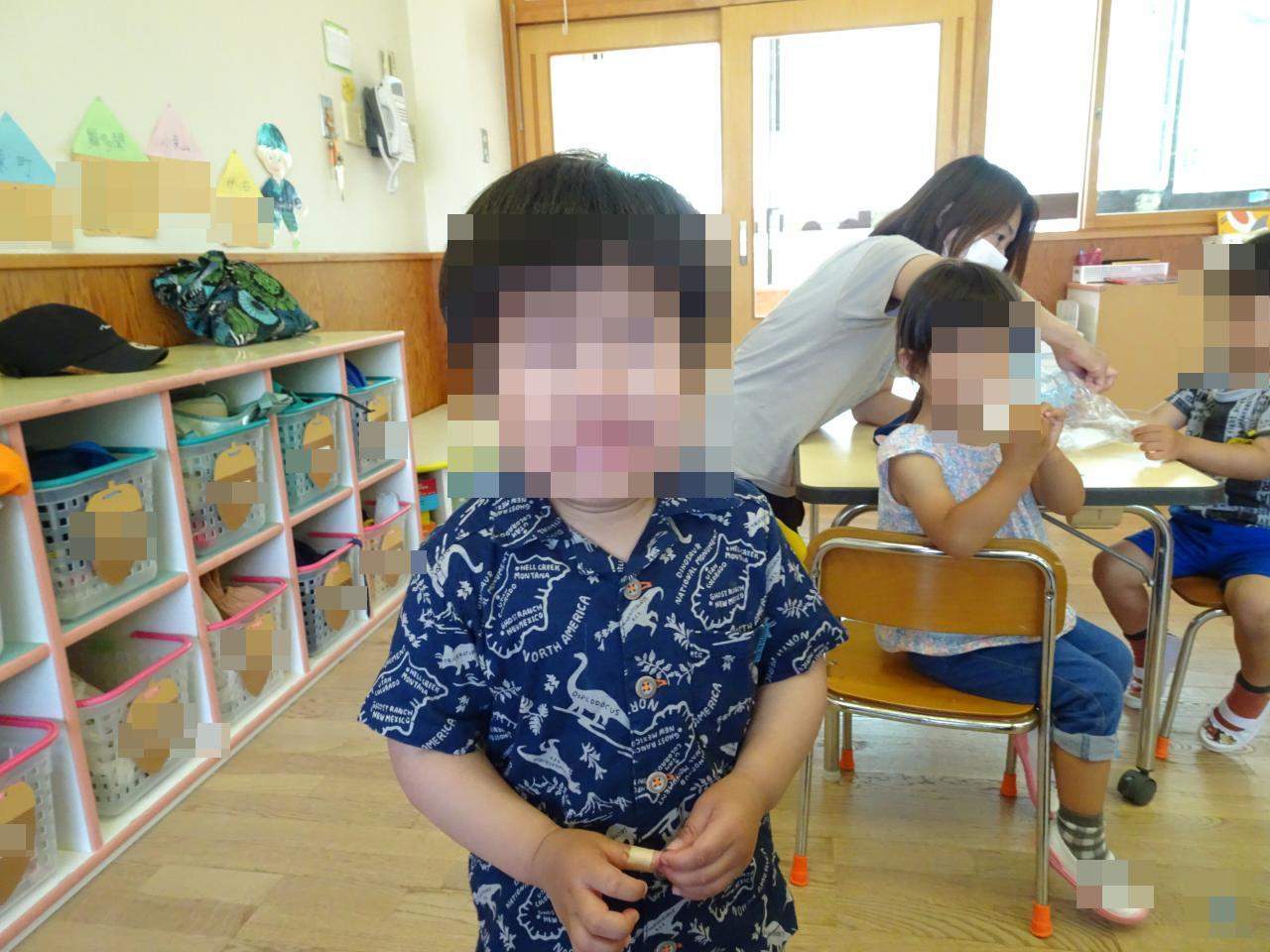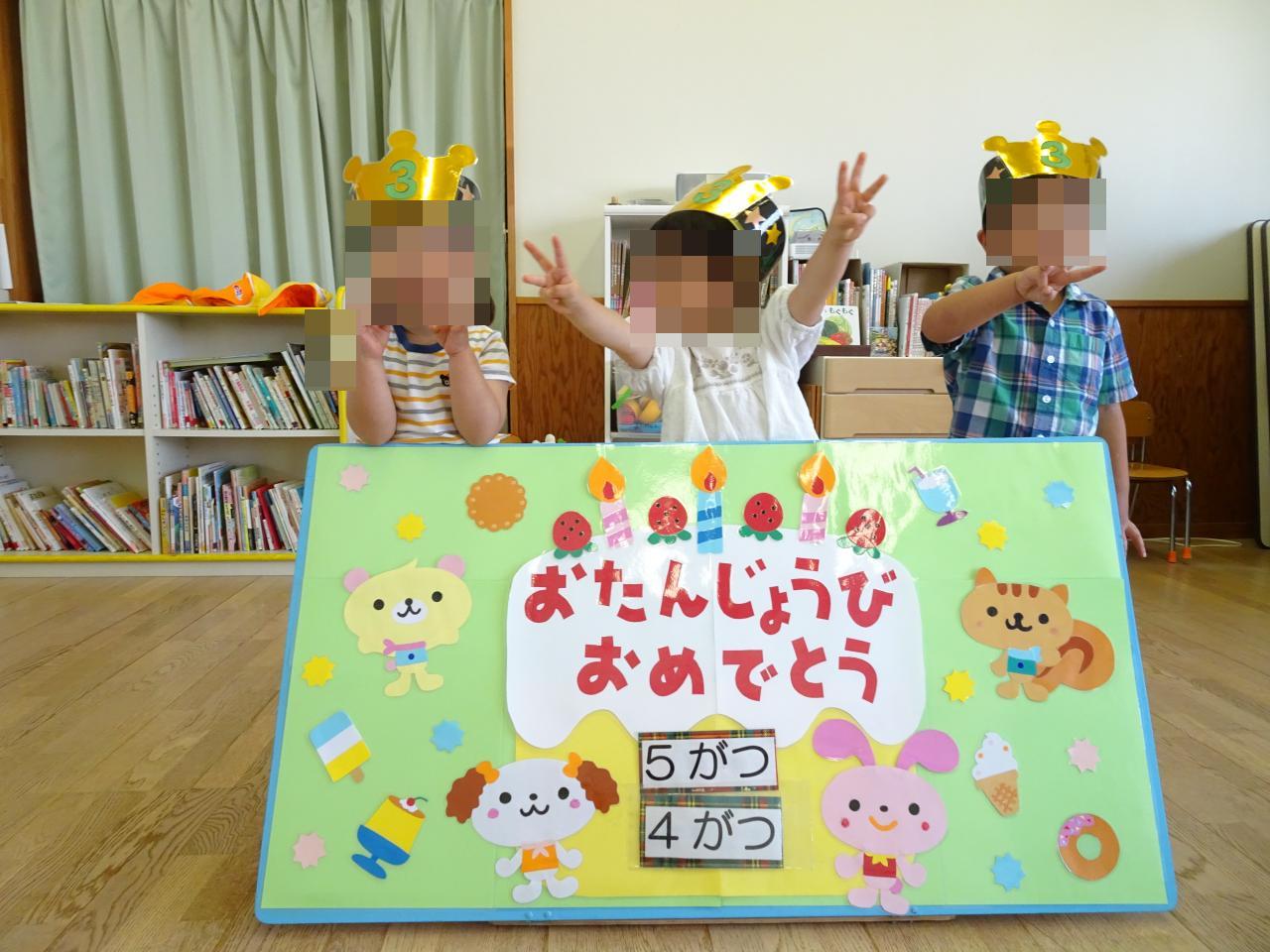 誕生会では、4月・5月生まれのお友だちをお祝いし、おやつを食べたり「はらぺこあおむし」のペープサートを見て楽しみました🤩