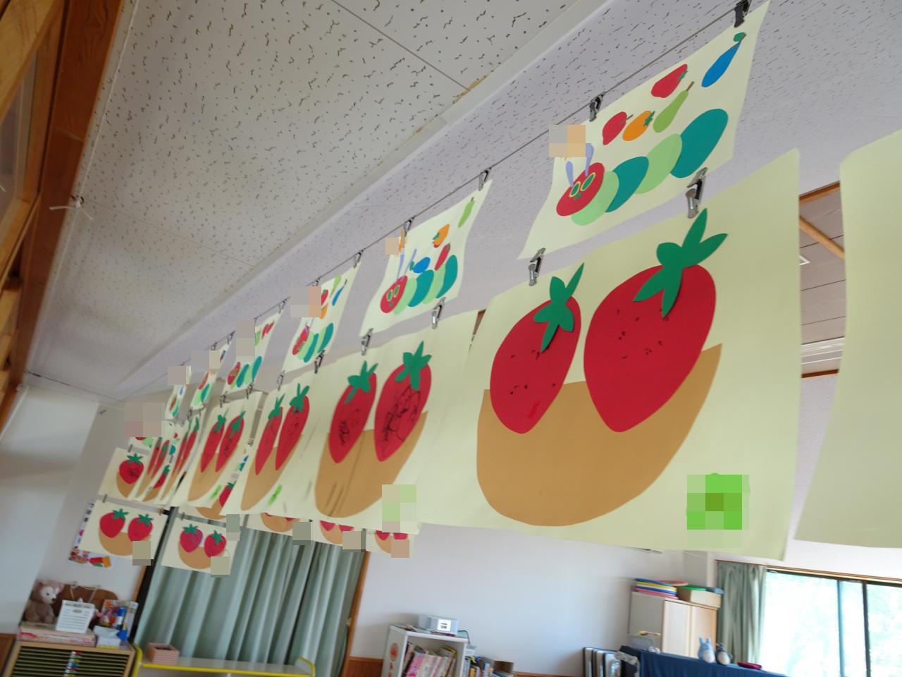 いちごの製作にも取り組み、初めてクレパスを持って、いちごの種を描いたり、のりを使って葉っぱを貼りました。