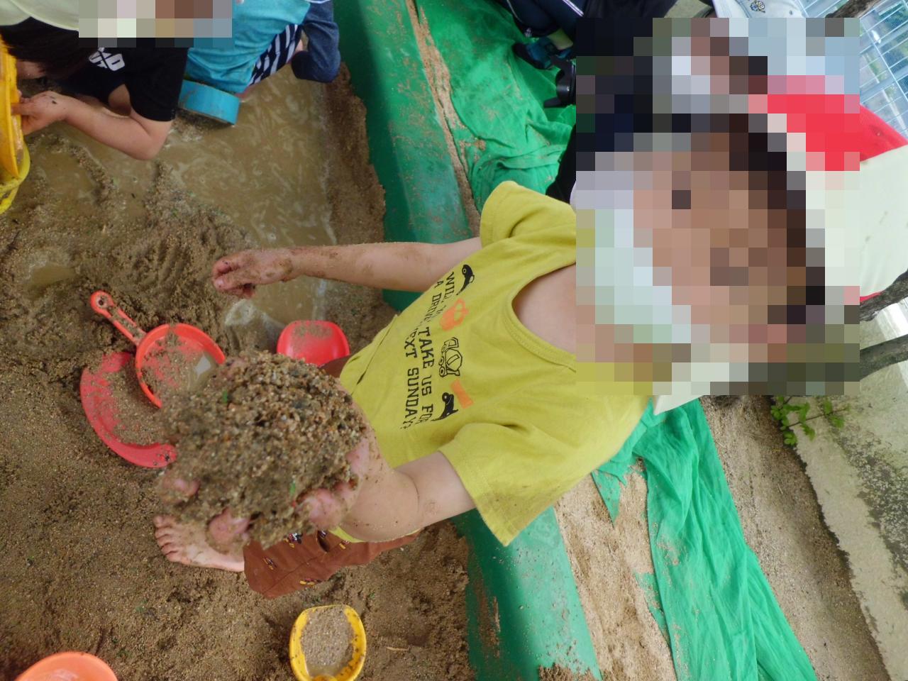 本日泥んこ遊びを行ったクラスは、泥がついた衣服をそのまま袋に入れてプールバックで持ち帰っておりますので、洗濯する際はお気をつけ下さい。
