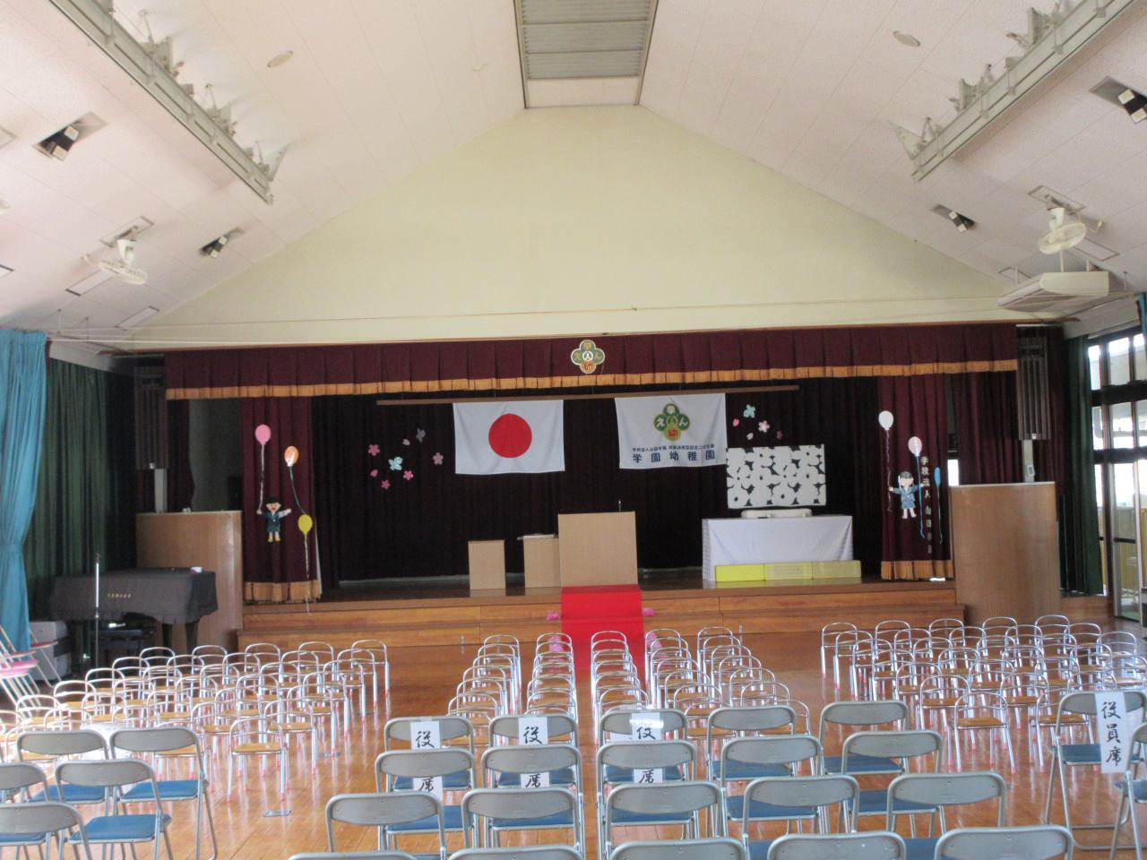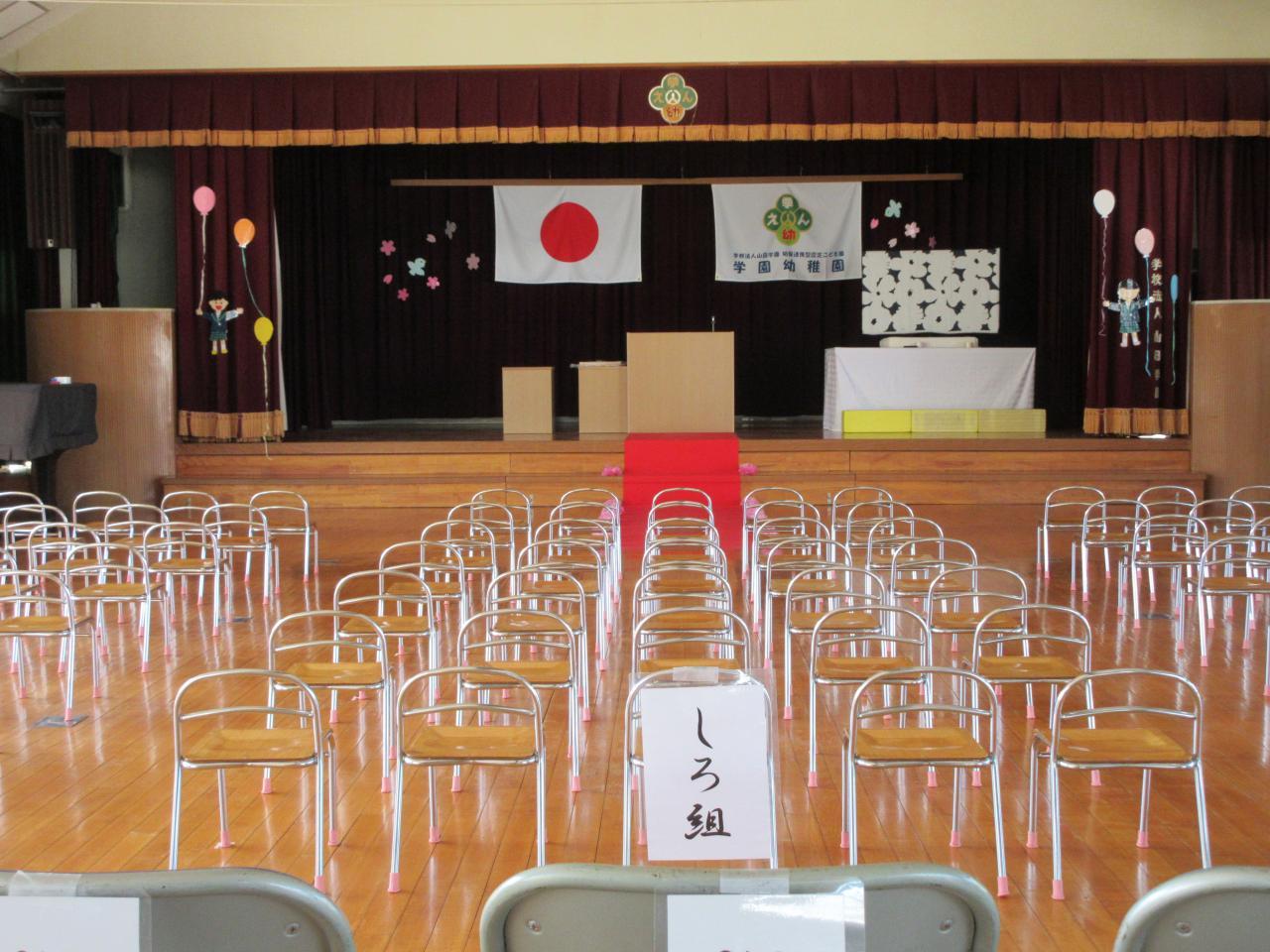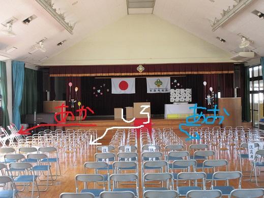 (あか組…ピアノと職員席の間 / しろ組…あか組としろ組の間 / あお組…しろ組とあお組の間)