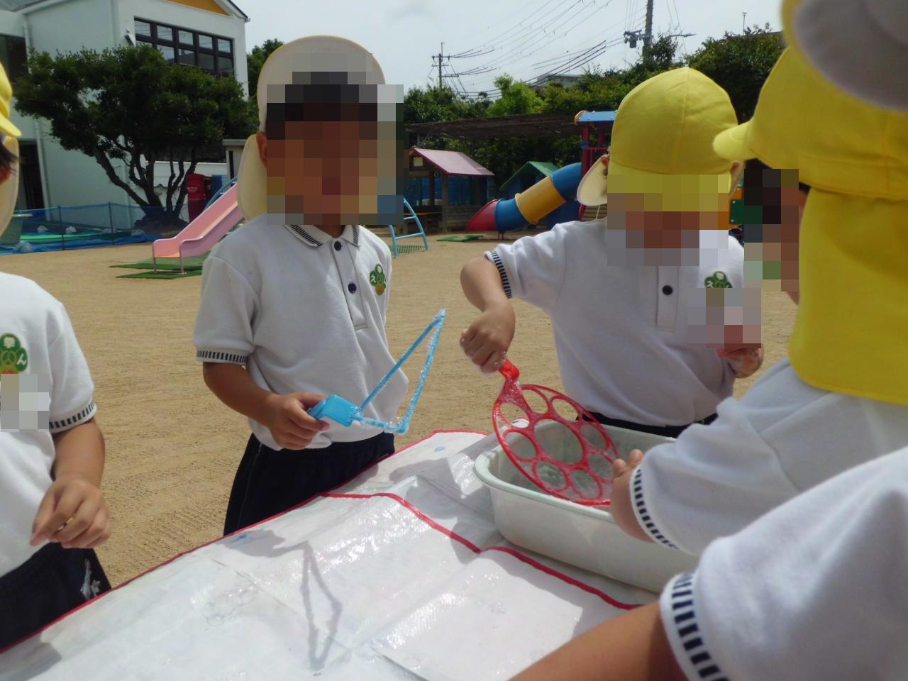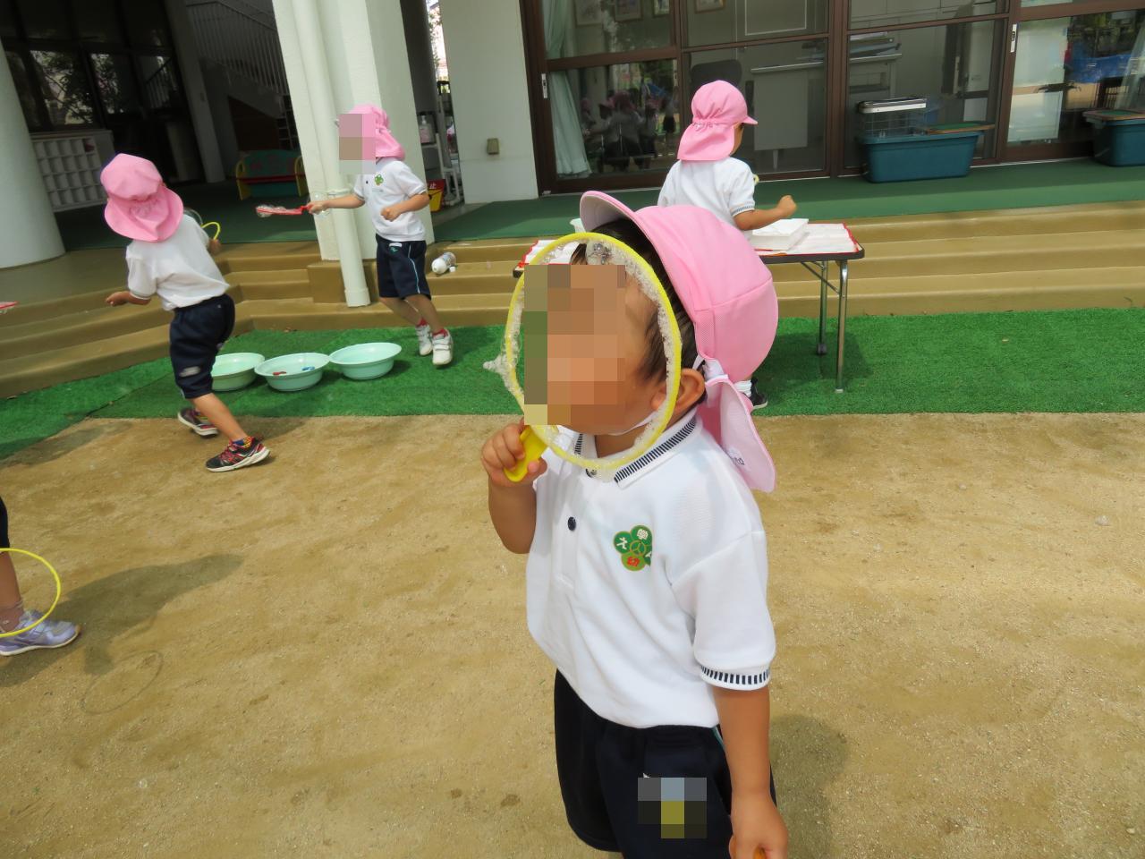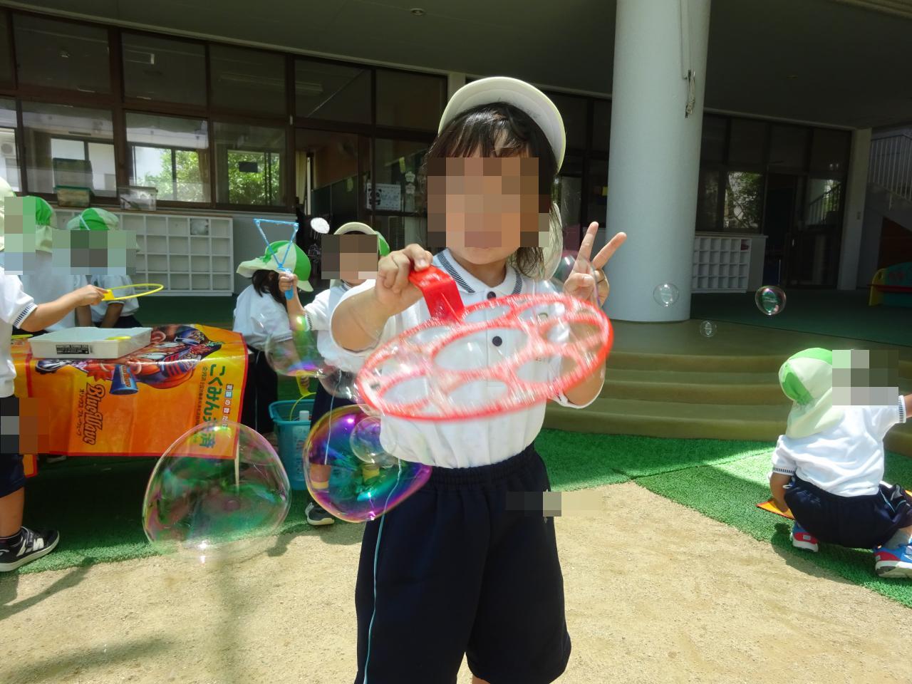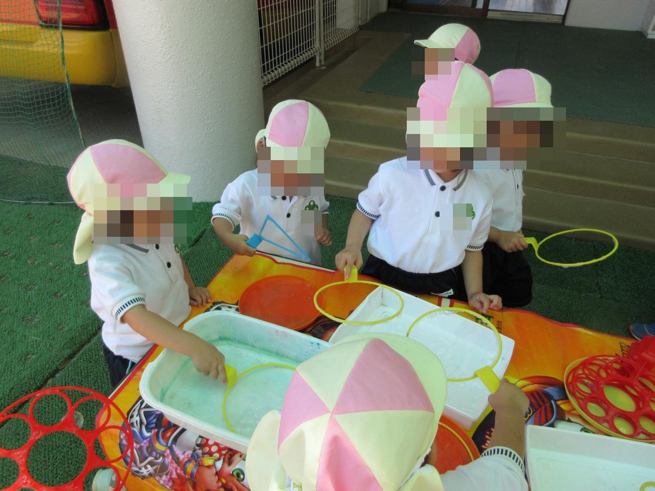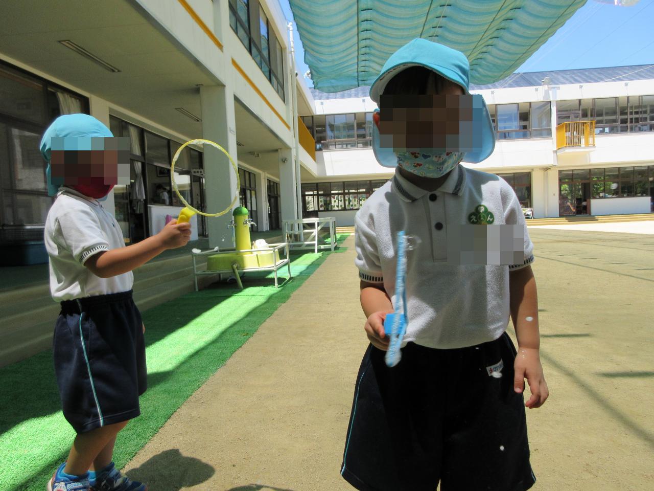今週、年中・年少さんは園庭でしゃぼん玉遊びを行いました!