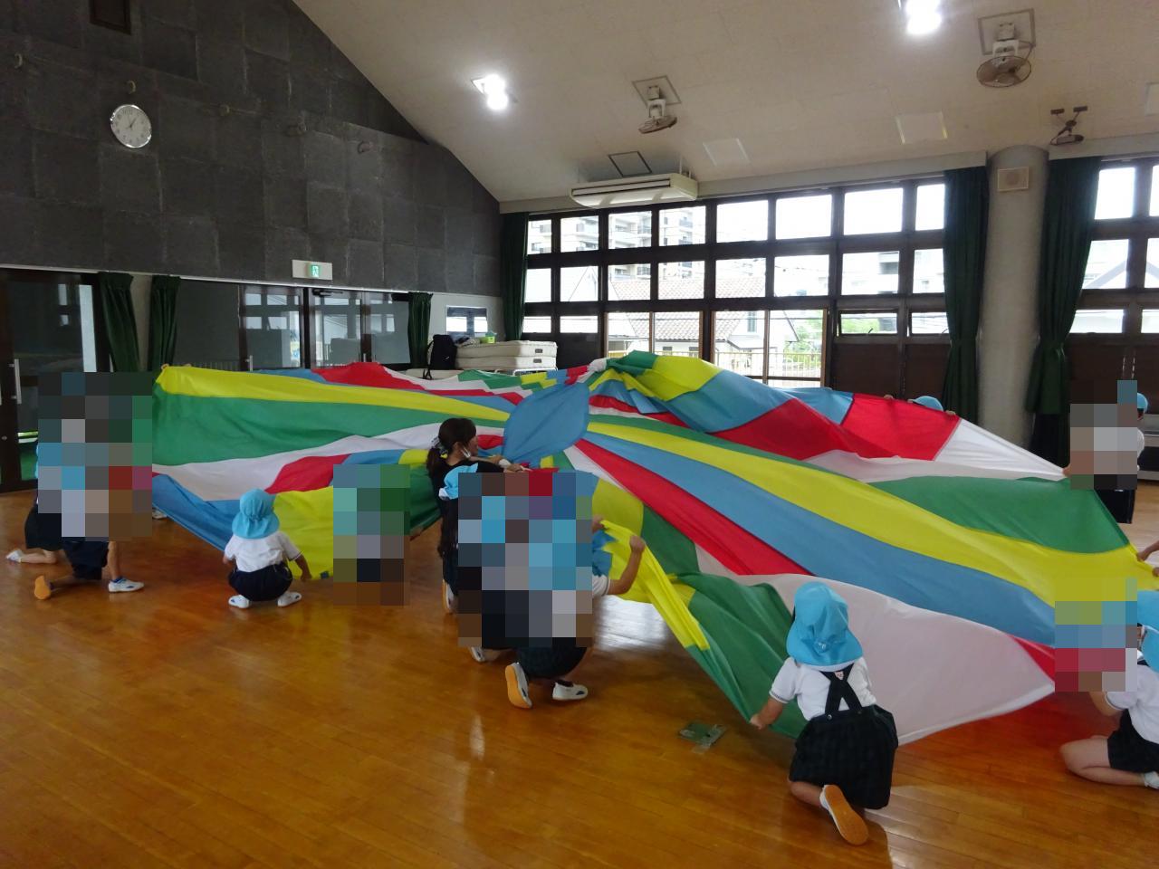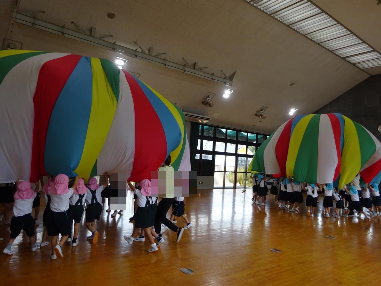年中さんは、パラバルーンの技をみんなで完成させようと力を合わせています!