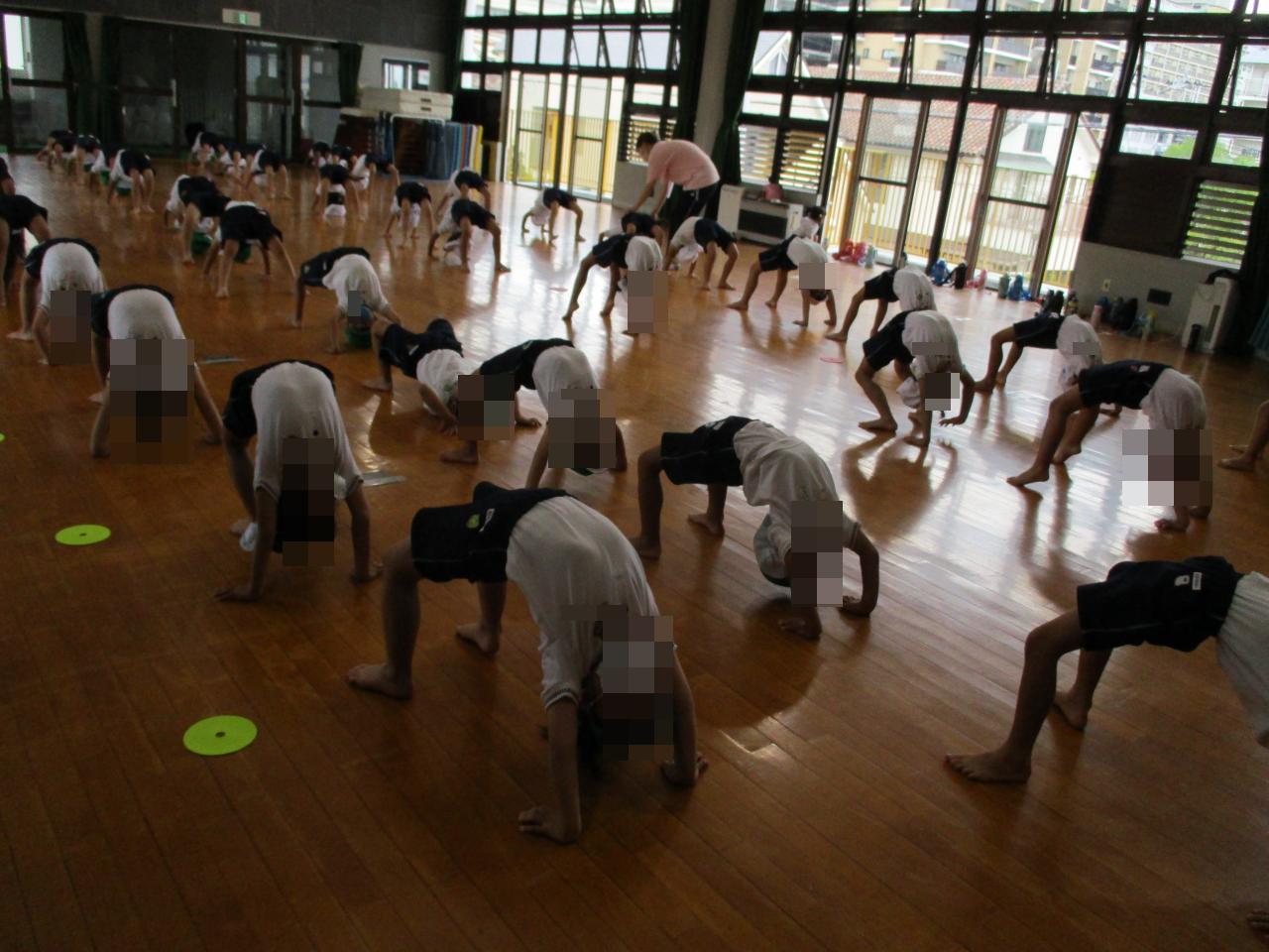 組体操の際、ブリッジや複数人の技で子どもたちの態勢が変わりますので、髪の長いお子様は髪の毛を踏まないようまとめておいて下さい。