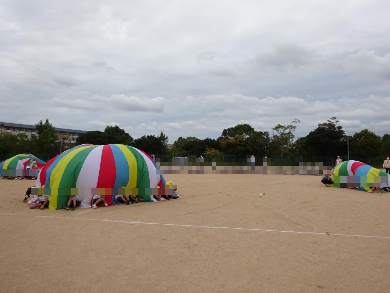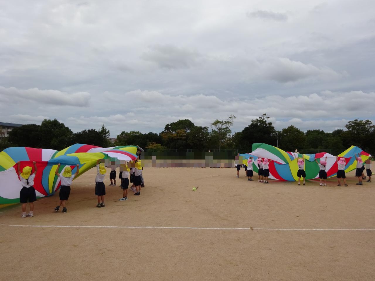 年中さんは広い校庭でパラバルーンの練習を行いました❗