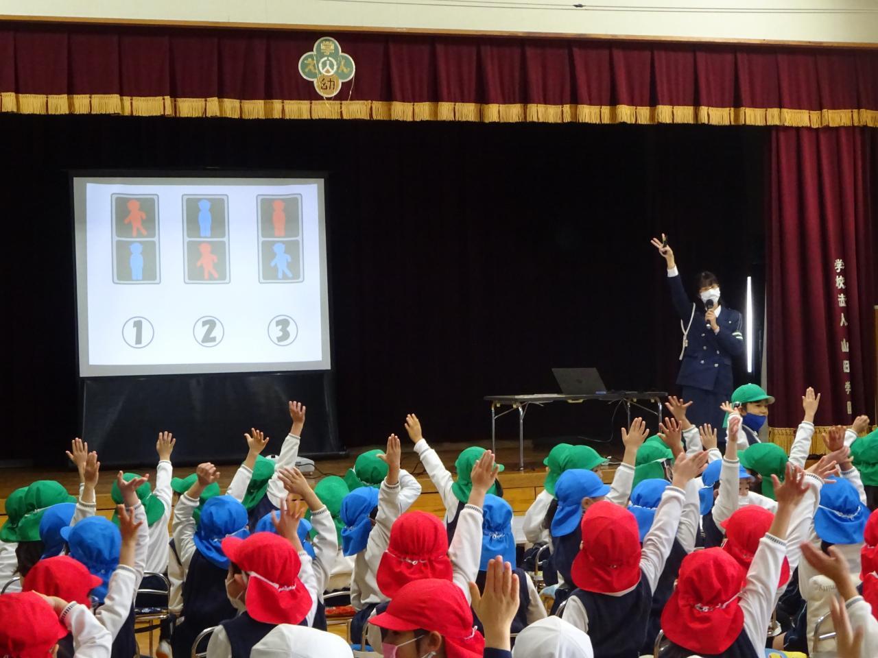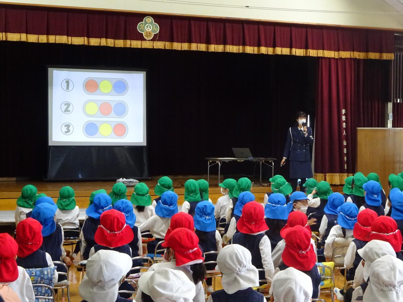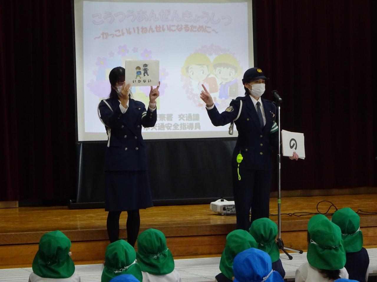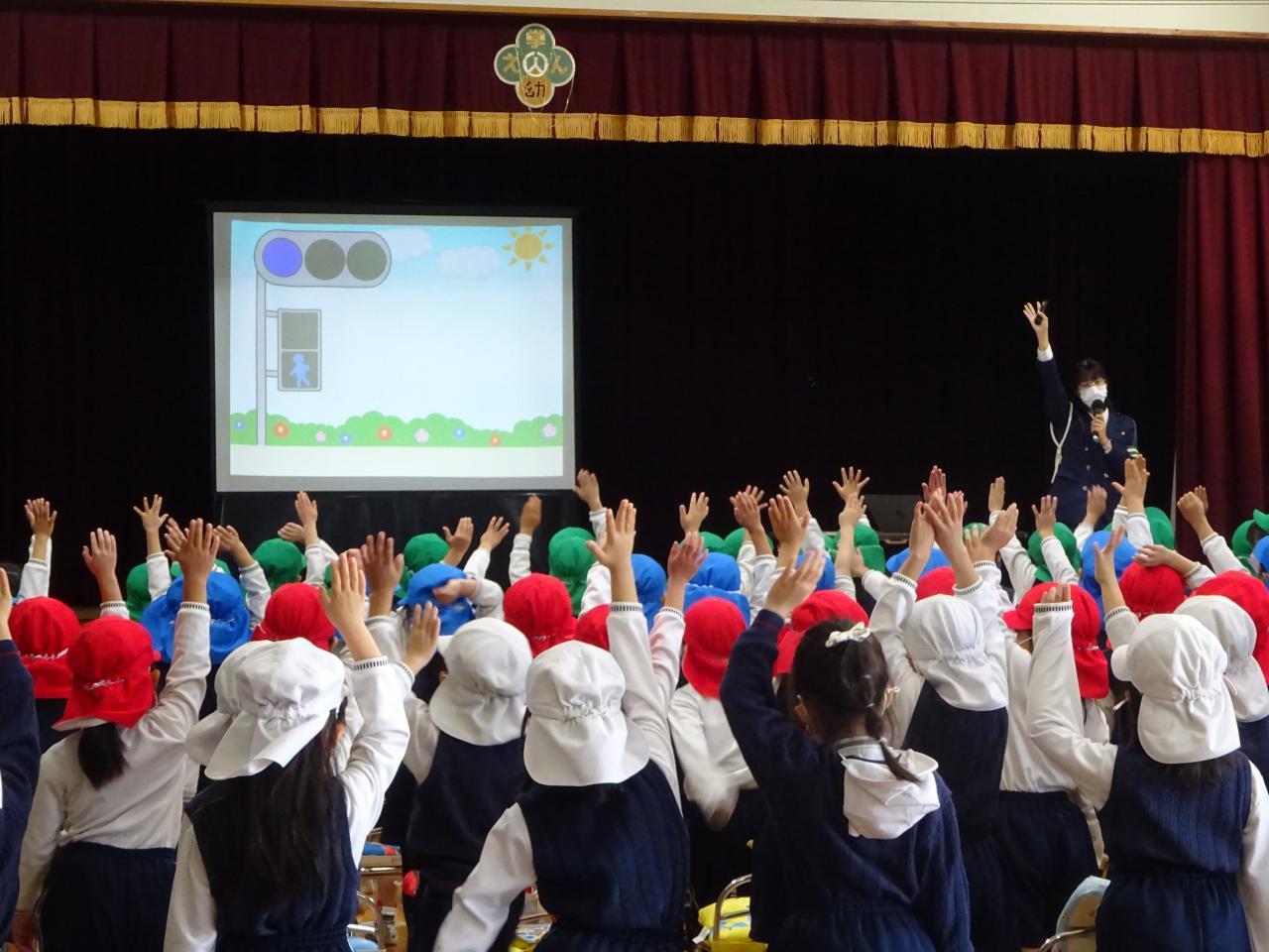 子どもたちも長い時間ではありましたが「けんちゃん」やスクリーンを使用したクイズ形式などを通して楽しく交通ルールについて学ぶことができました✨