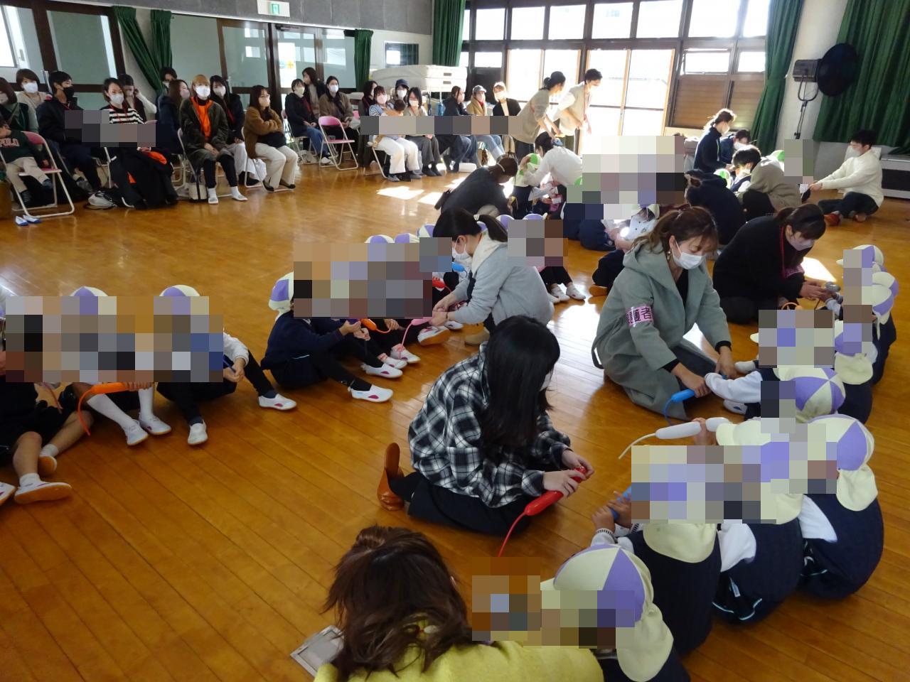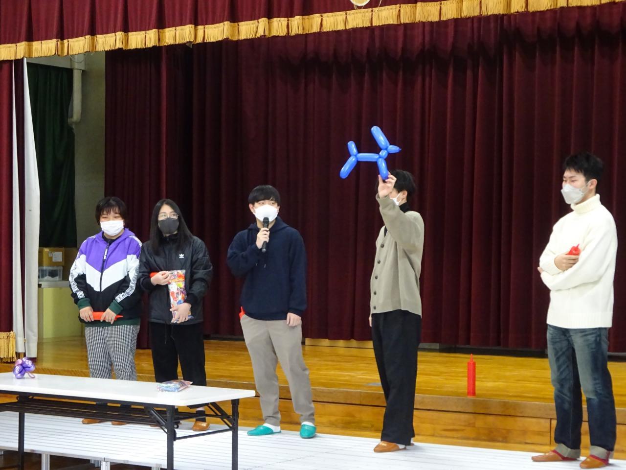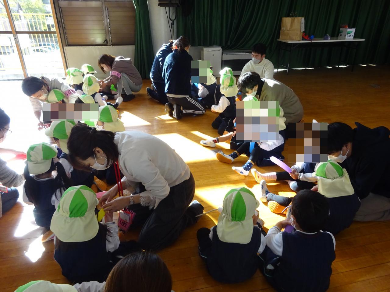 作る前には流通科学大学のお兄さん、お姉さんがバルーンを使ってお花やタコ、剣やクマなどバルーンを様々な形に変身させてくれて「すごーい!!」と盛り上がっていました🙂