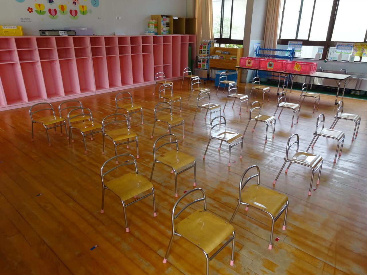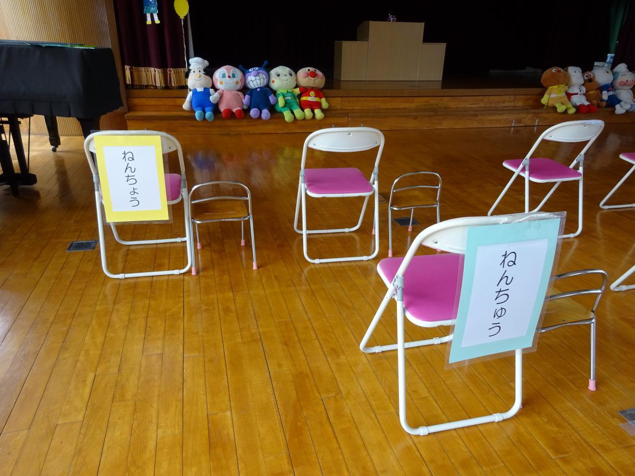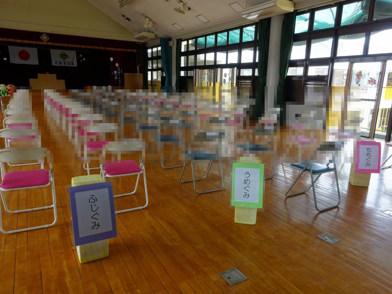 クラスごとにパイプ椅子が並んでおり、園児名を貼らせて頂いていますので確認の上、お座り下さい。