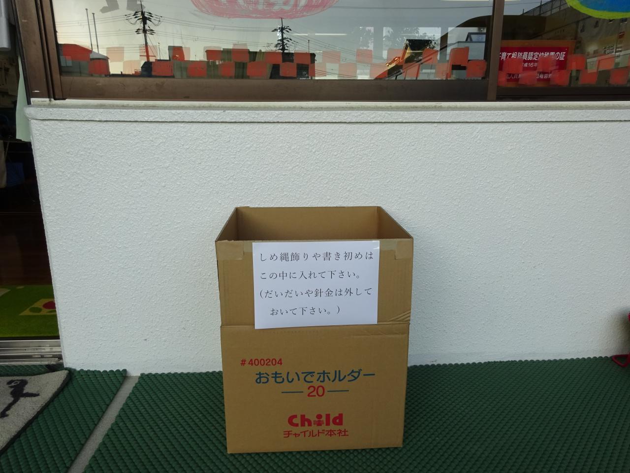 しめ縄飾りや書き初めをお持ち頂ける方は、職員室前の段ボールに入れて下さい。