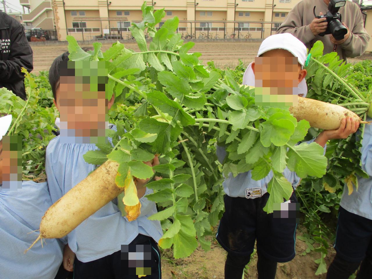 この大根収穫が、幼稚園生活最後の収穫でした。寂しいけれど、たくさんの新鮮なお野菜にいっぱいパワーをもらうことができたね✨