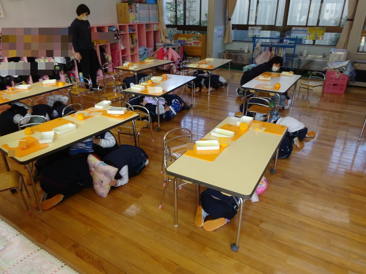 突然の放送に、園庭で遊んでいるクラスや身体測定をしているクラス等もありましたが、放送をしっかりと聞き避難姿勢をとることができました。