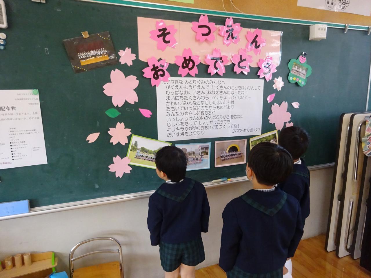 本日は卒園式にお越し頂きありがとうございました。皆様のご協力のおかげでとてもすてきな門出の1日となりました。お天気にも恵まれ、また全員出席でこの日を迎えられたことをとても嬉しく思います。