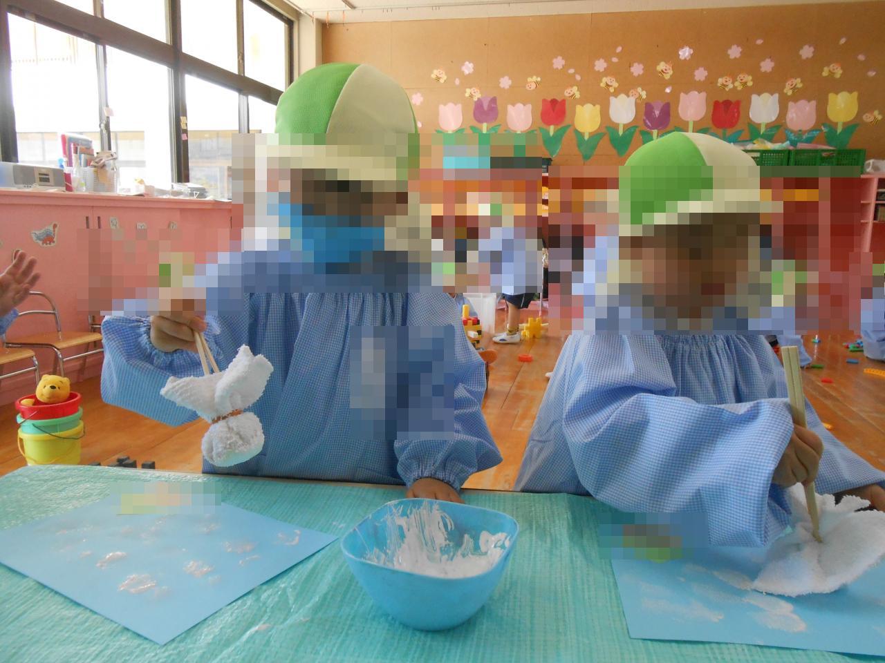 幼稚園のお空を元気に泳いでいるこいのぼりを見ながら、初めての絵の具に挑戦しました🍀