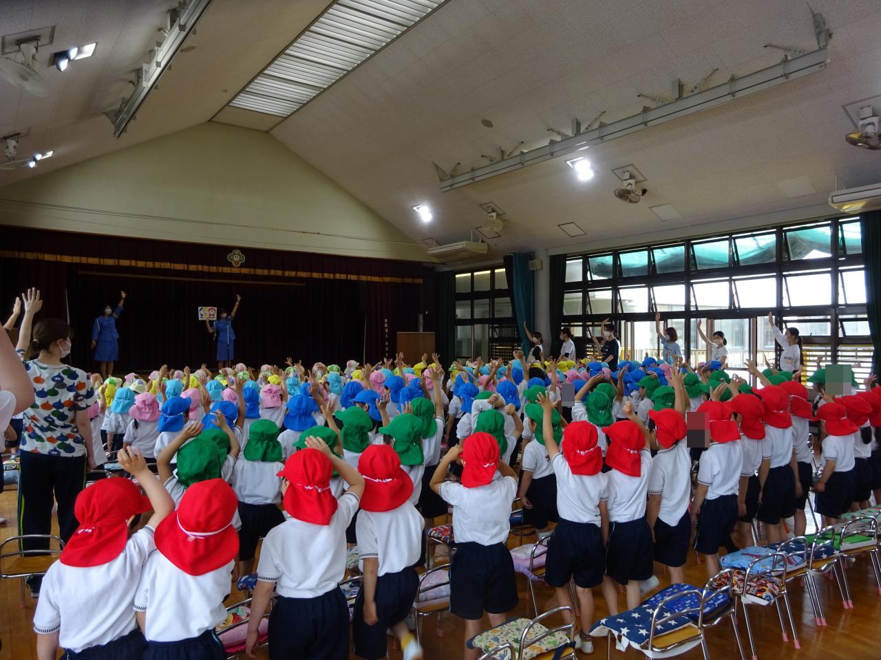 残念ながら、本日の歩行訓練は園庭に水たまりがあり中止となってしまいましたが、その場で①止まる、②右、左、右の確認、③パーにして大きく広げて手をあげるをみんなで実践しました🙋
