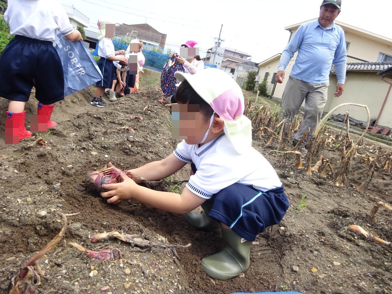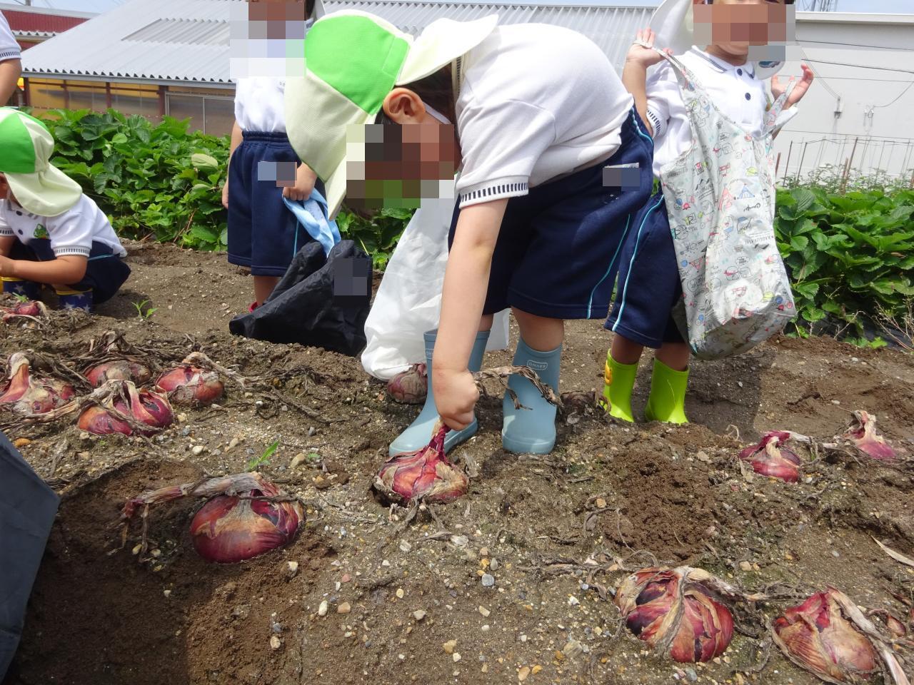 畑の先生に、赤い玉ねぎと白い玉ねぎの2種類があることを教えて頂き、「たくさん採るぞ~!」と力を振り絞って収穫する姿が見られました😆