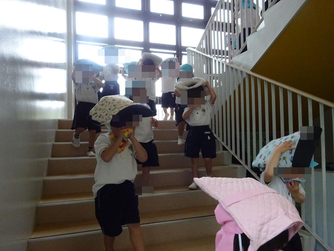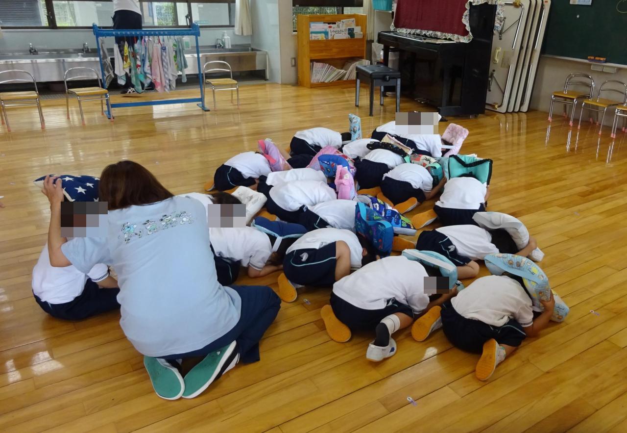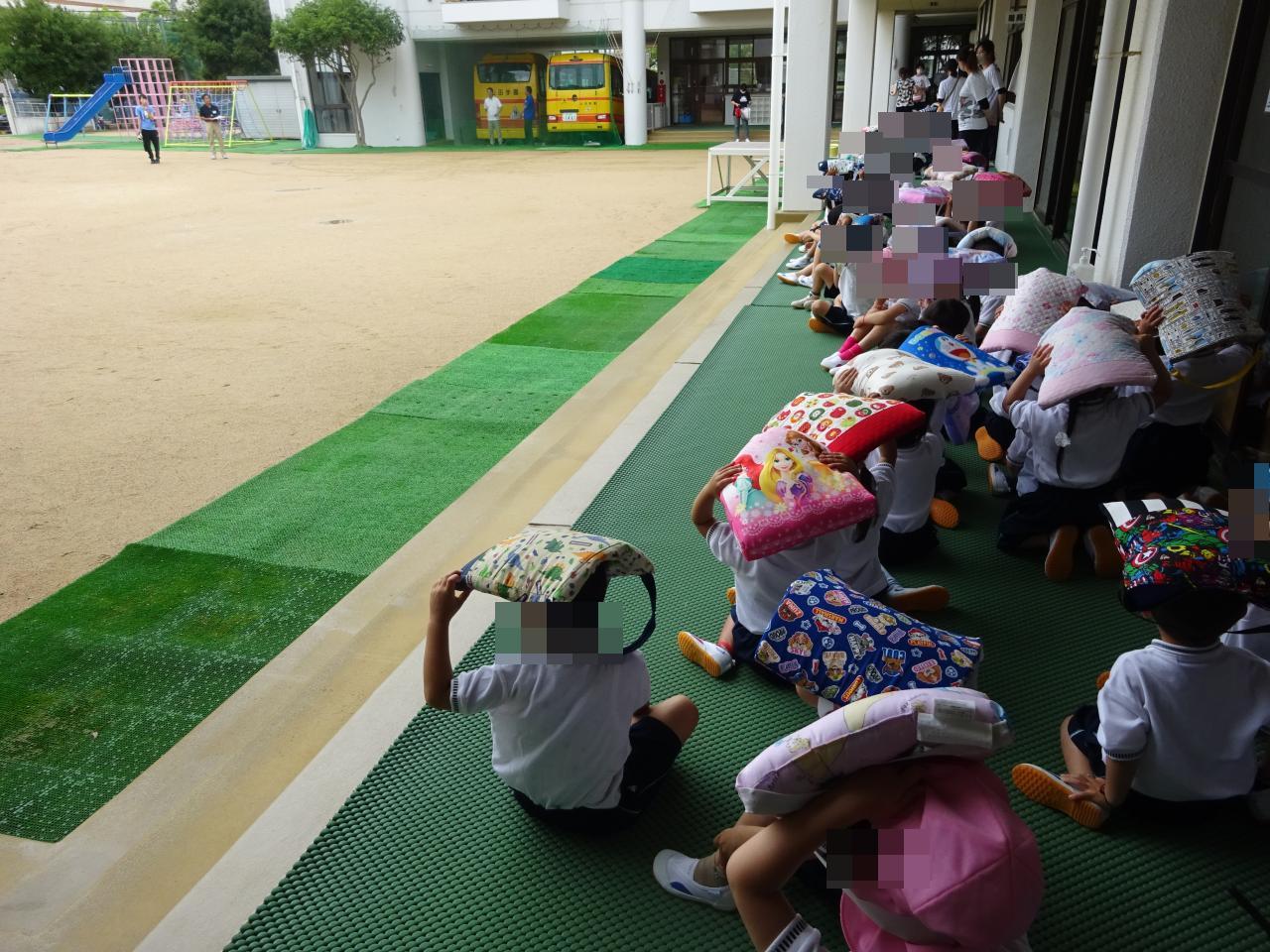 園長先生の放送やサイレンの合図で担任の先生の周りに集まり、座布団を頭につけ上手に体を守る子どもたち✨