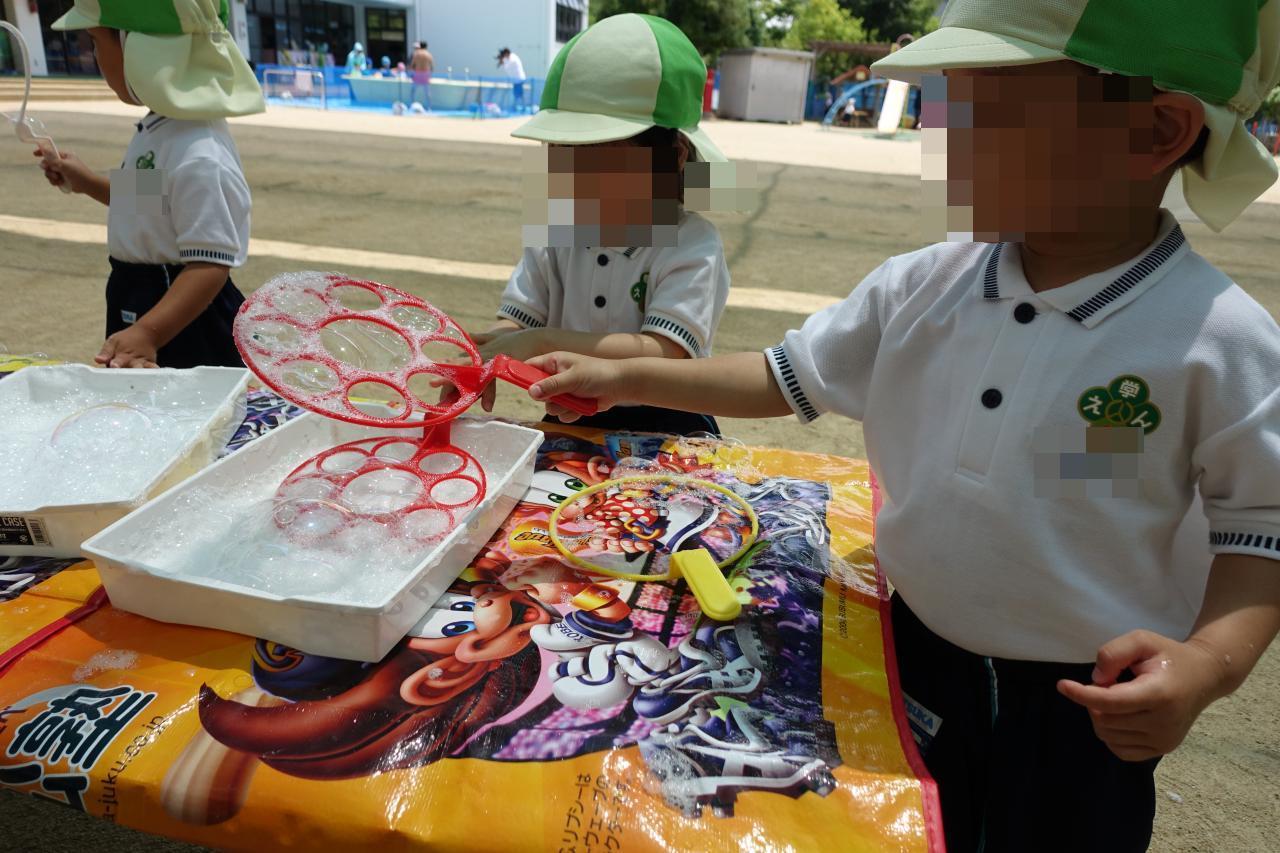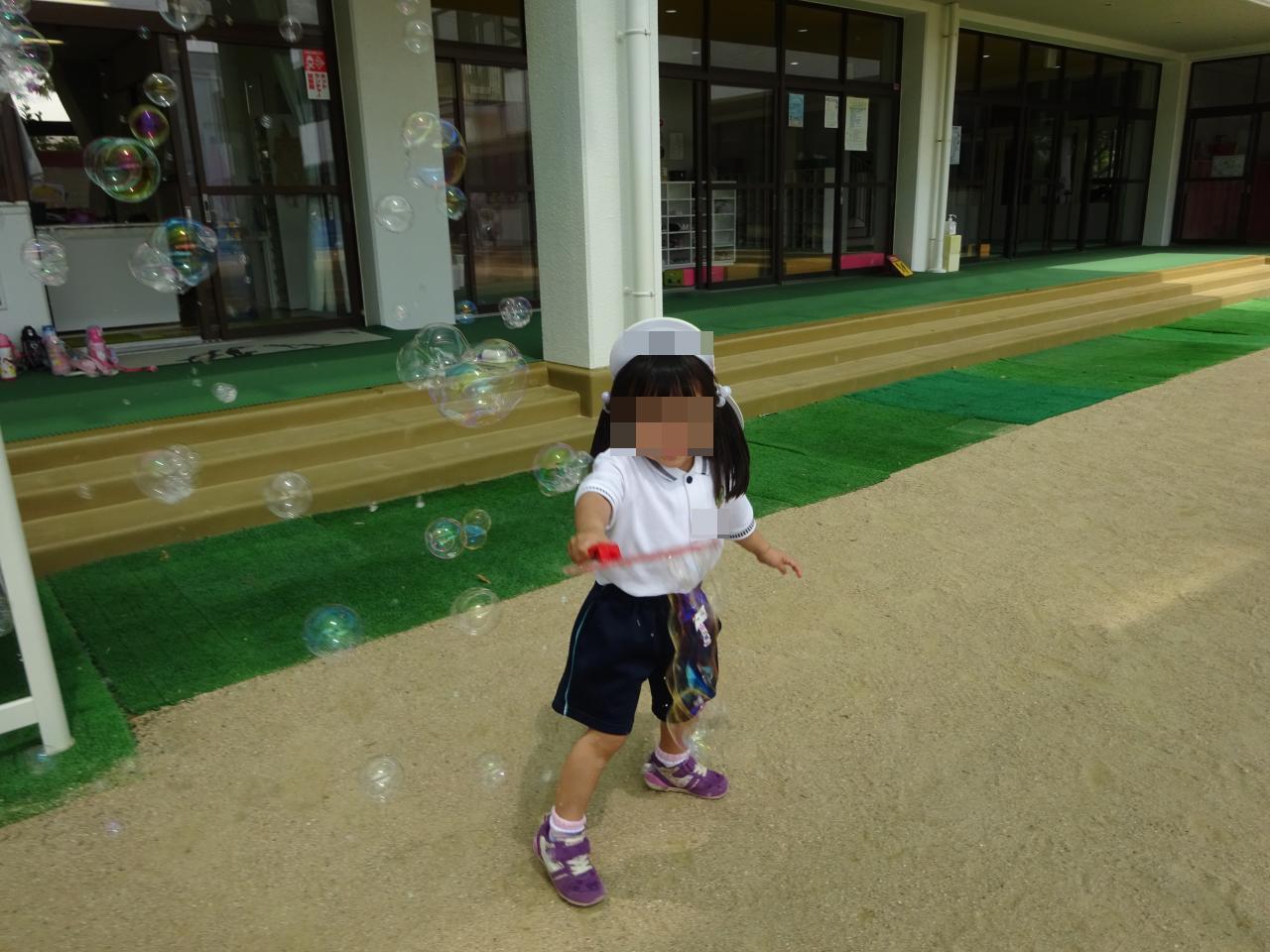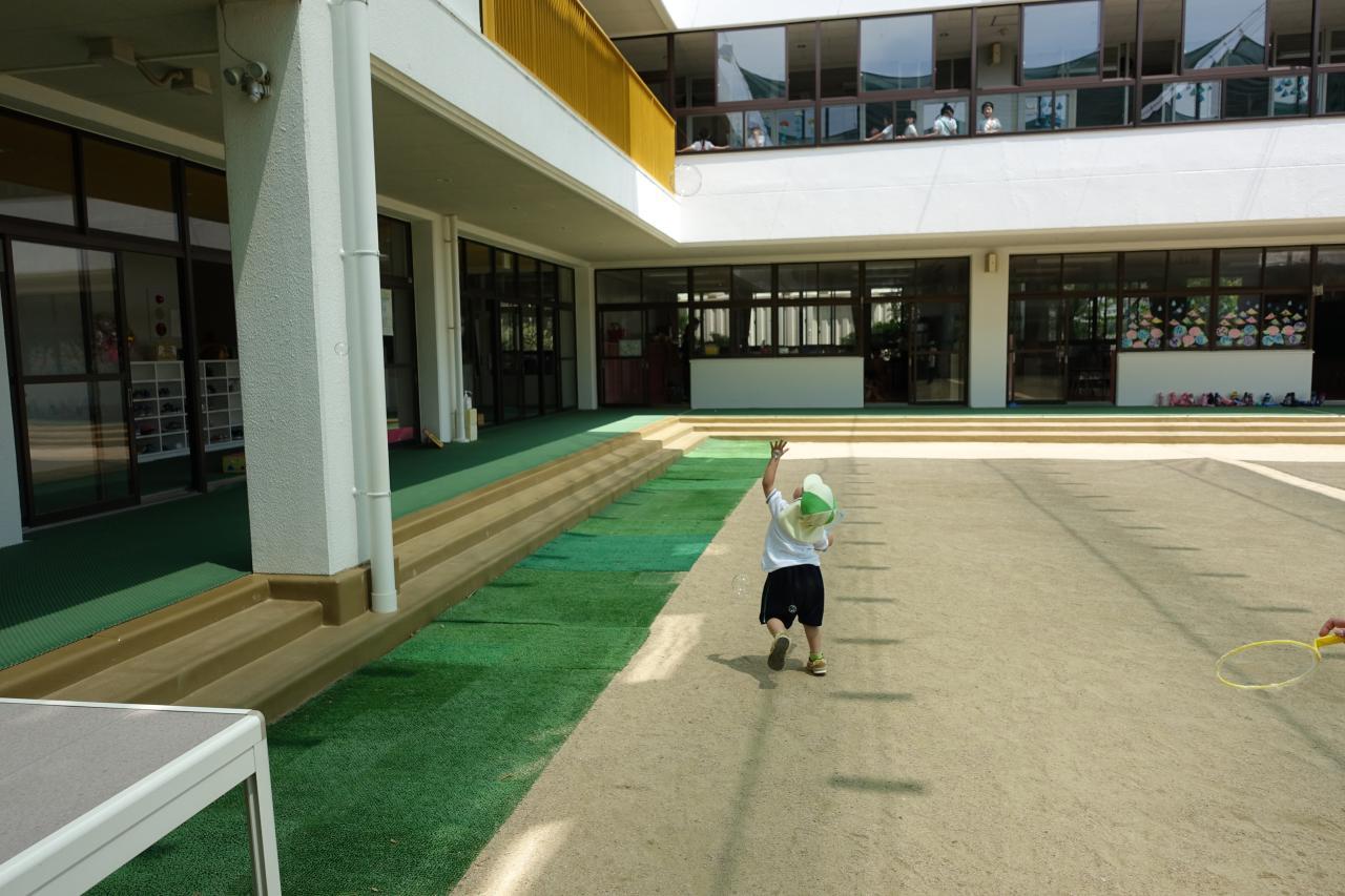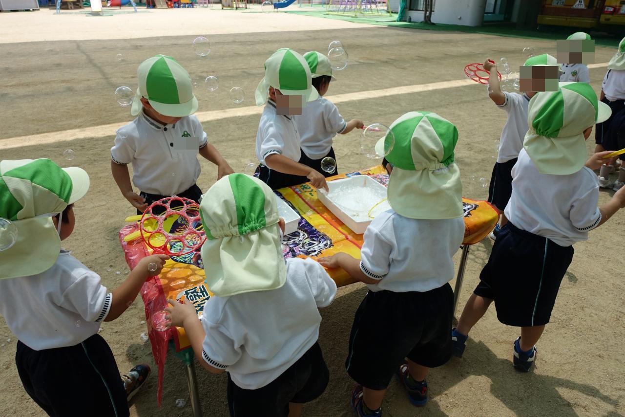 今日も暑さが感じられるお天気でしたが、年少さんは初めてのしゃぼん玉遊びを楽しみました🙂