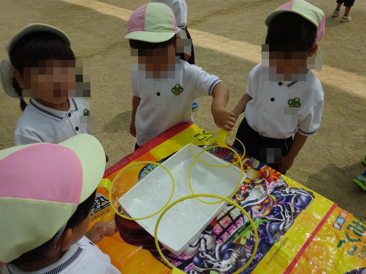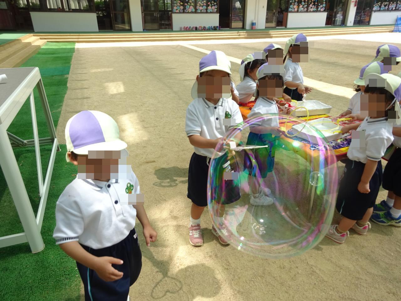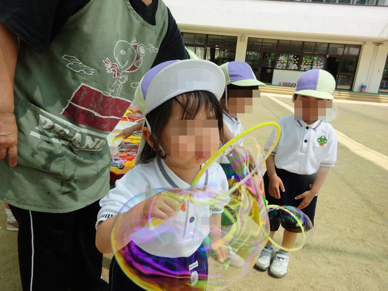 大きなしゃぼん玉ができると、「おっきーい😳」と驚きの声もあがり「どうやったん?」とお友だちとの会話も楽しみながら遊ぶことができました🎵