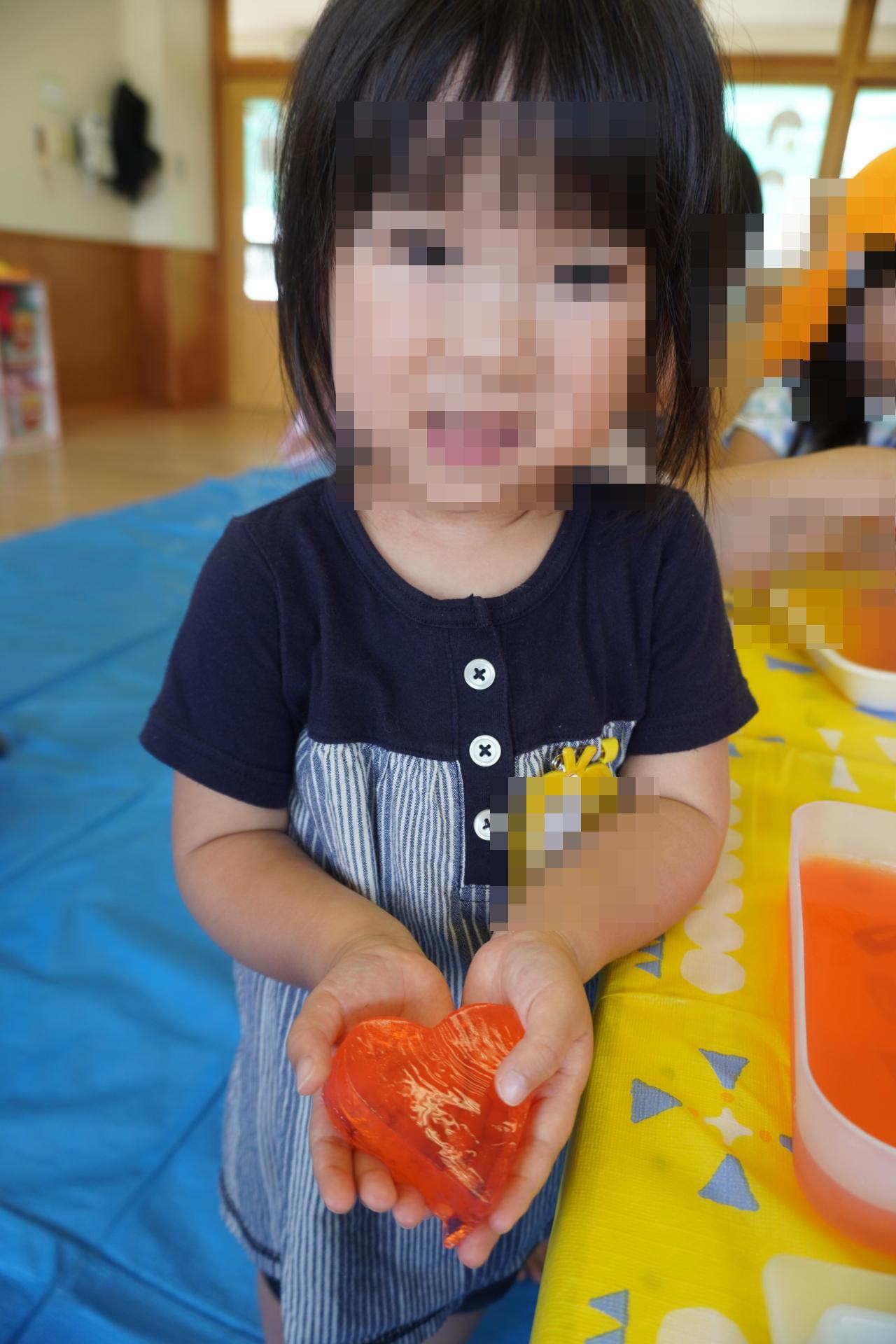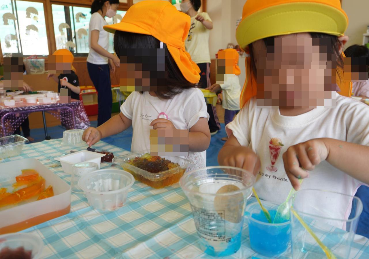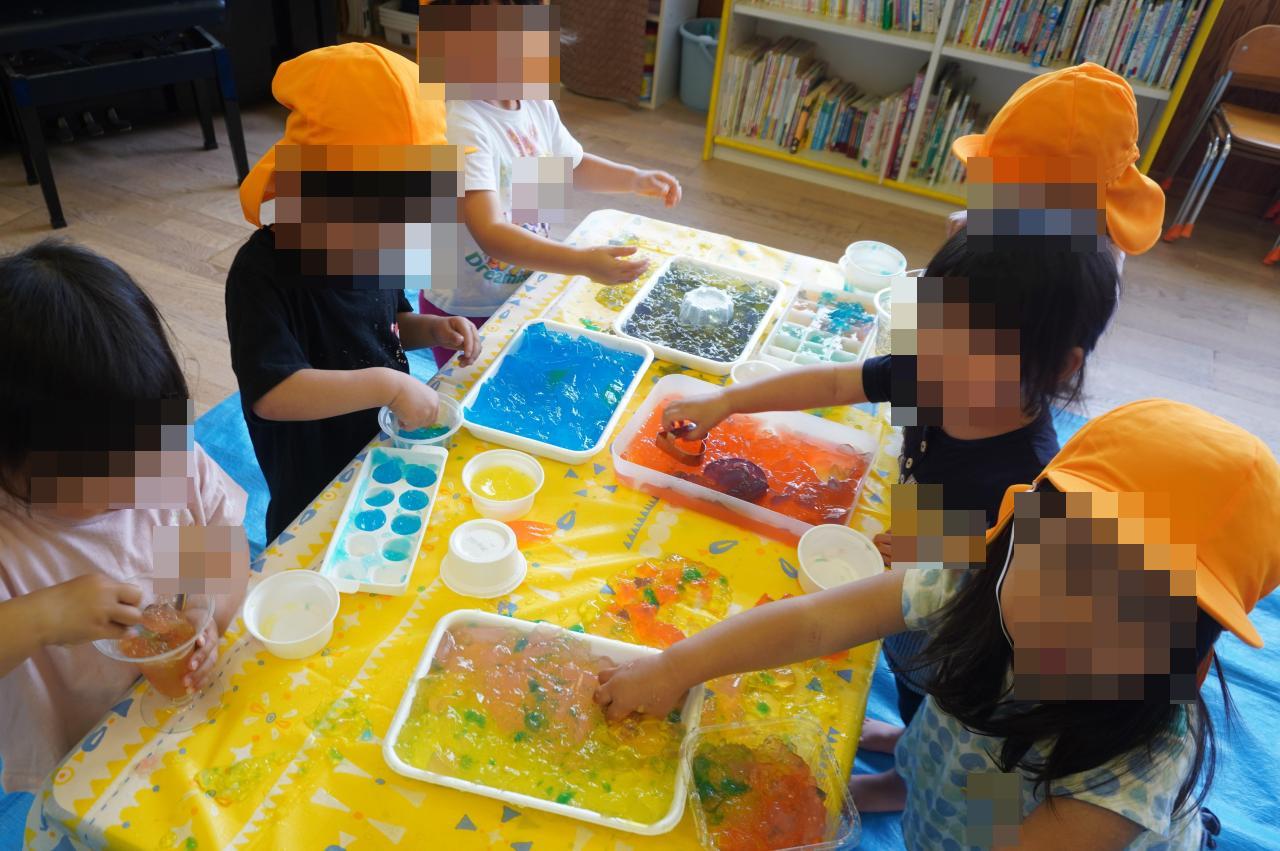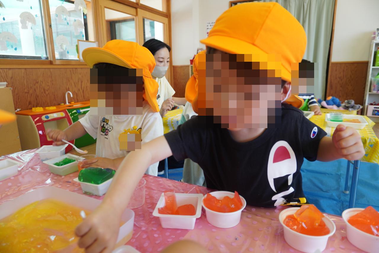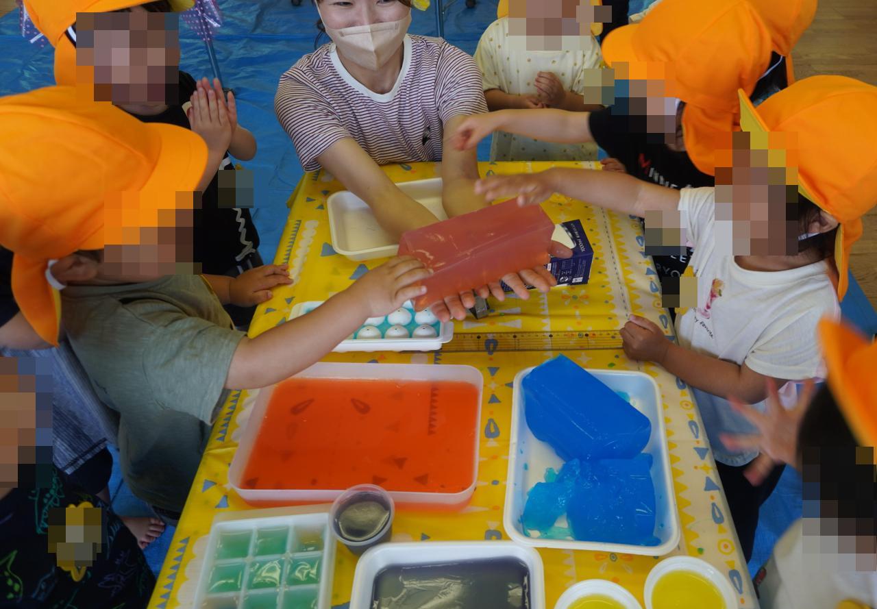 色とりどりの寒天に興味津々😳!!ひんやりと冷たくて、つるつる、ぷるぷる💕