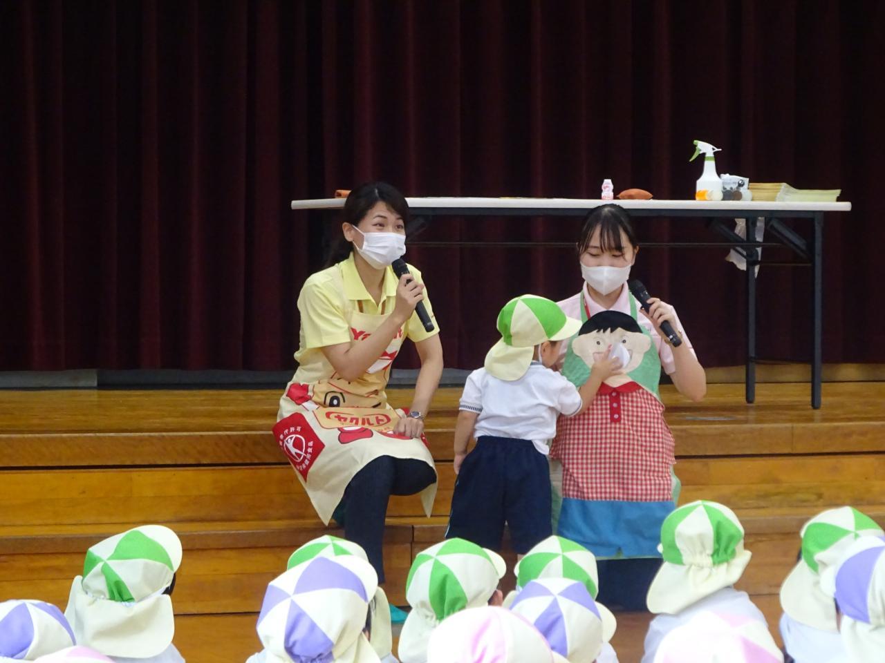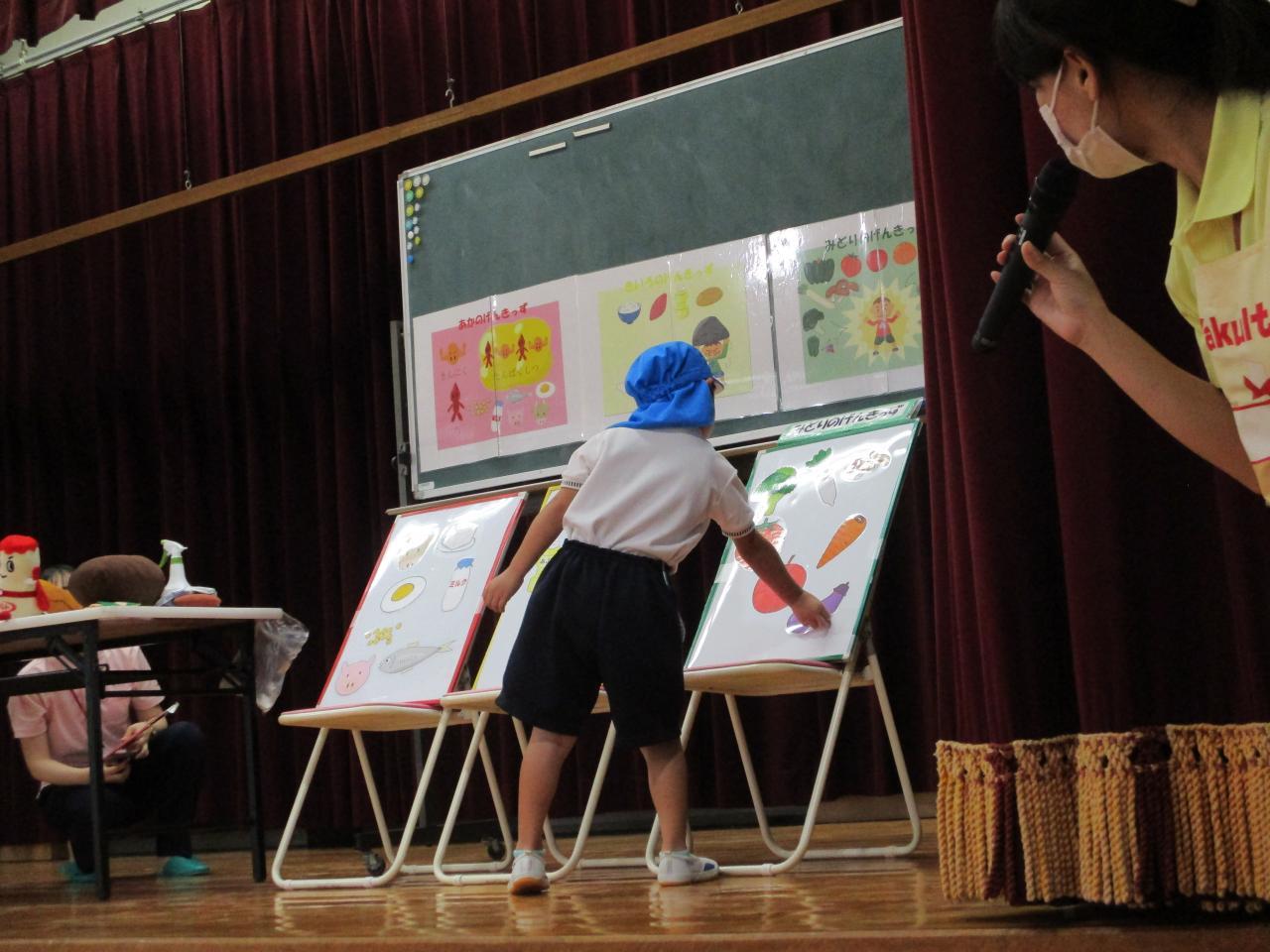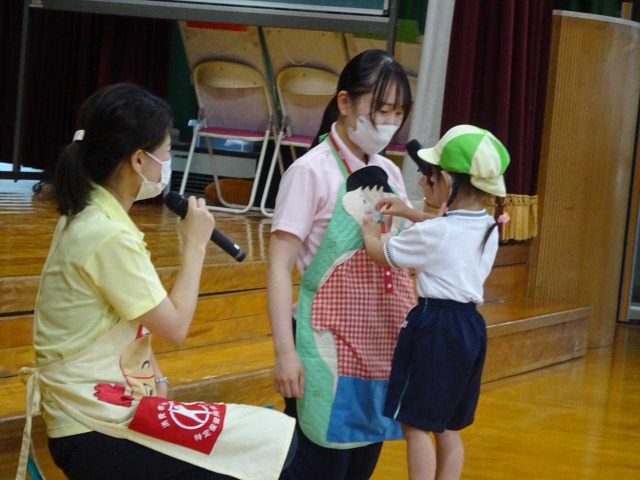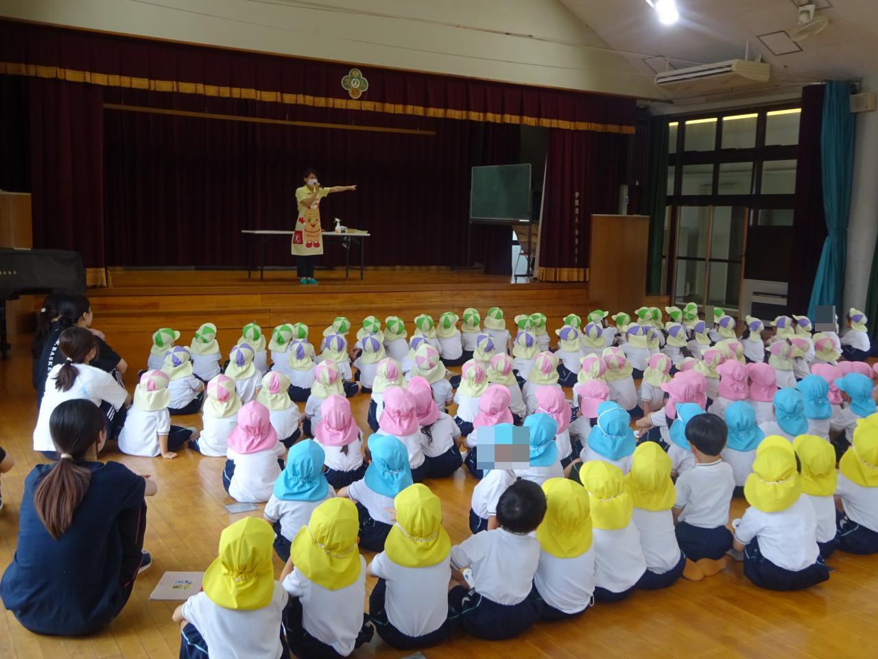 年少さんと年中さんは、エプロンシアターを使って、「食べ物とおなかの中の仕組み」について教えて頂き、年長さんはぬいぐるいや食材のカードを用いた体験型で学びました❗