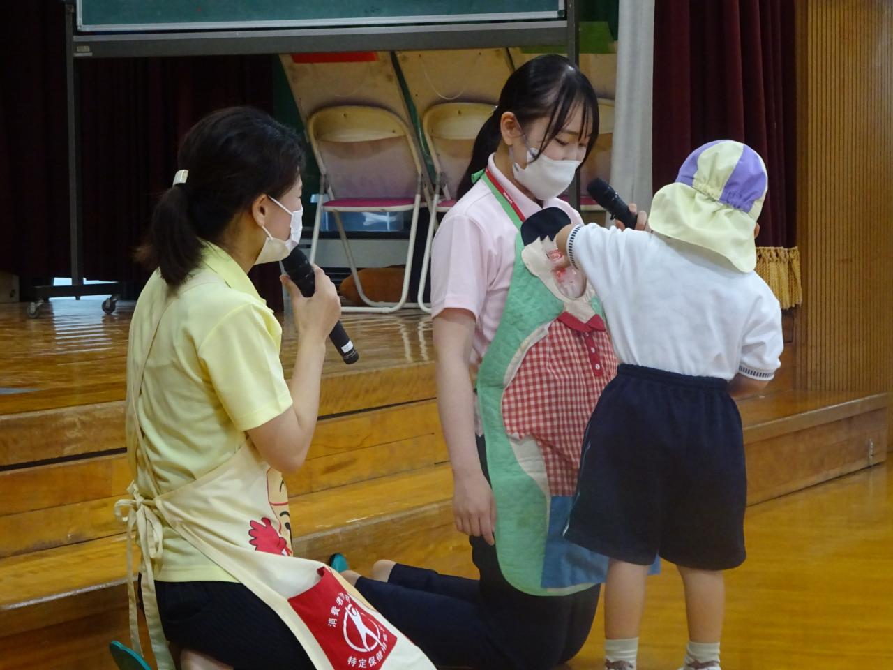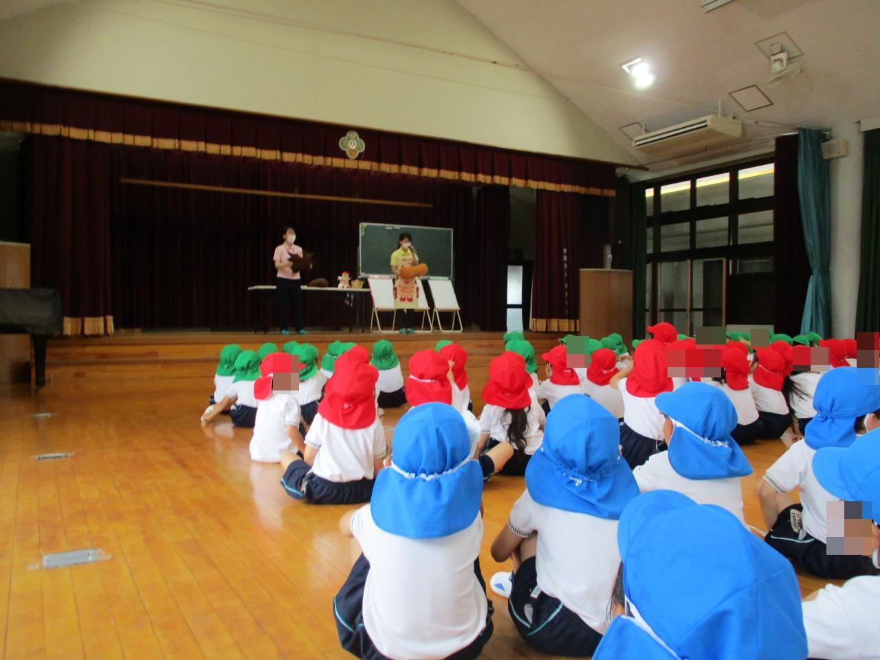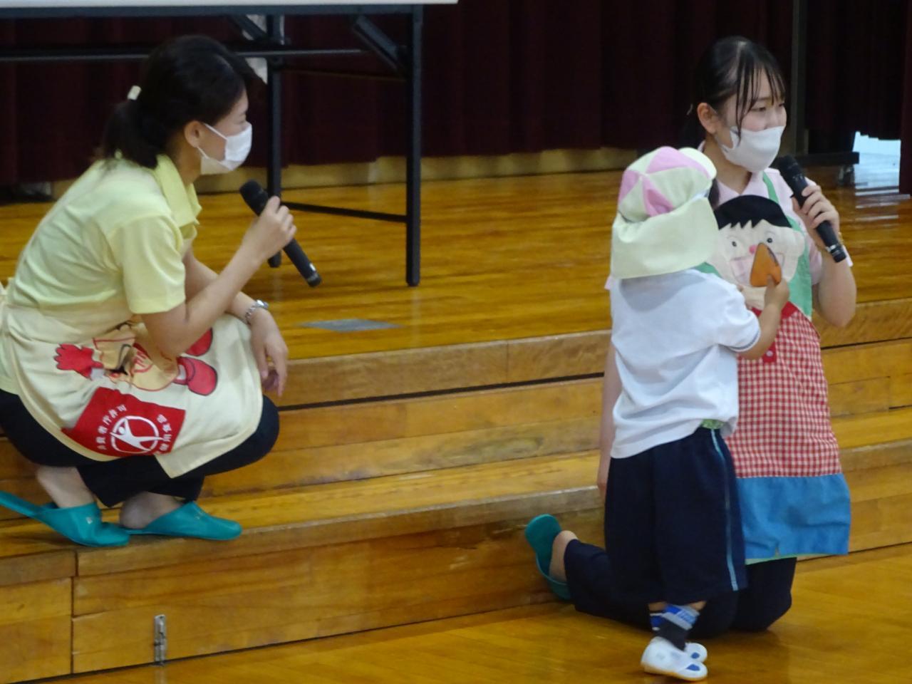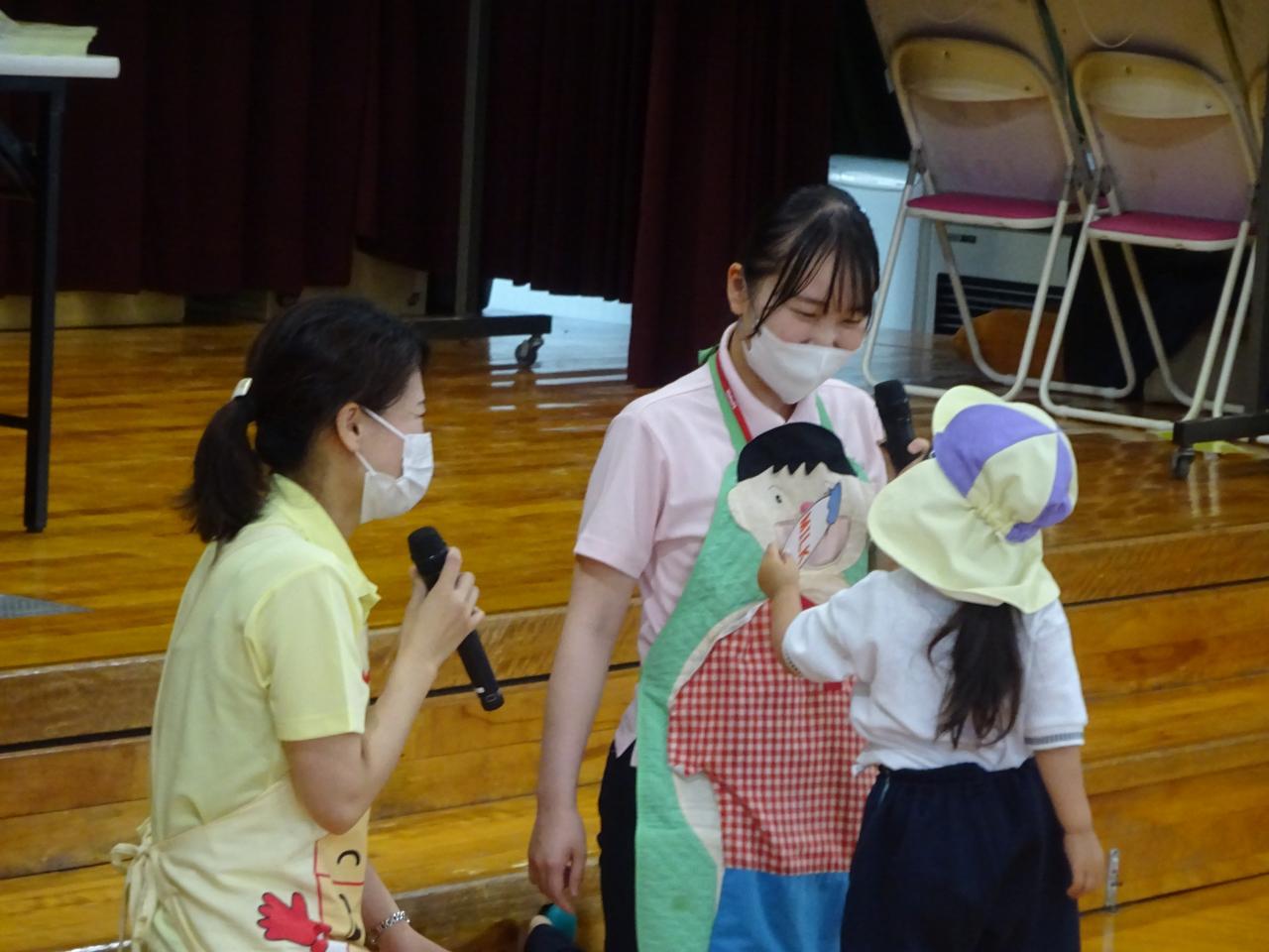 年少さんと年中さんは、エプロンシアターを使って、「食べ物とおなかの中の仕組み」について教えて頂き、年長さんはぬいぐるいや食材のカードを用いた体験型で学びました❗