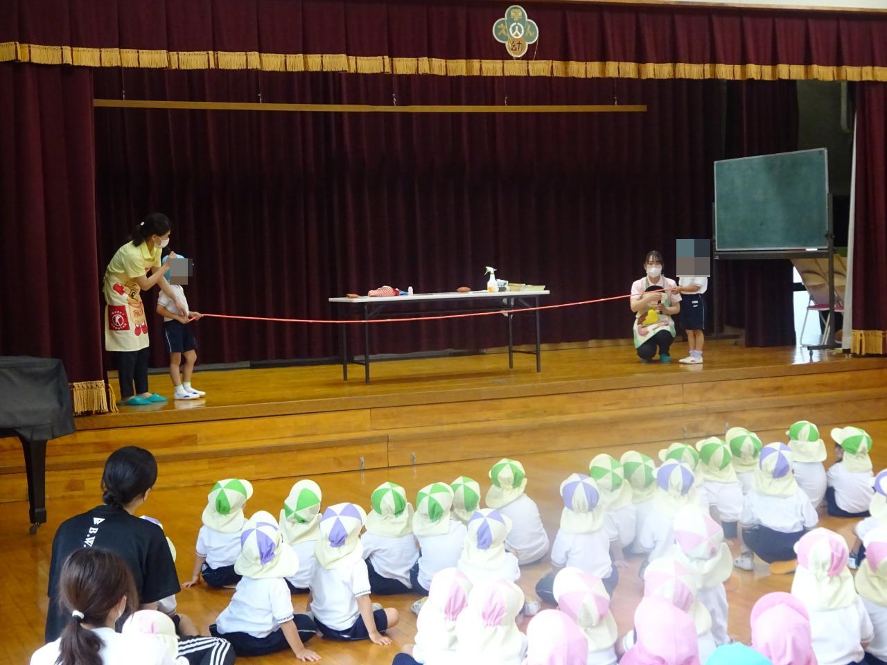 はじめに、「どんなうんちがあるかなぁ??」とみんなで「ころころ~」「べちゃべちゃ~」「バナナうんち~」とうんちについて学び、「一番健康なうんちはどれかなぁ??」と聞かれると「バナナうんち!!」、年長さんは健康なうんちの色についても教えて頂き、クイズを楽しんでいました😄